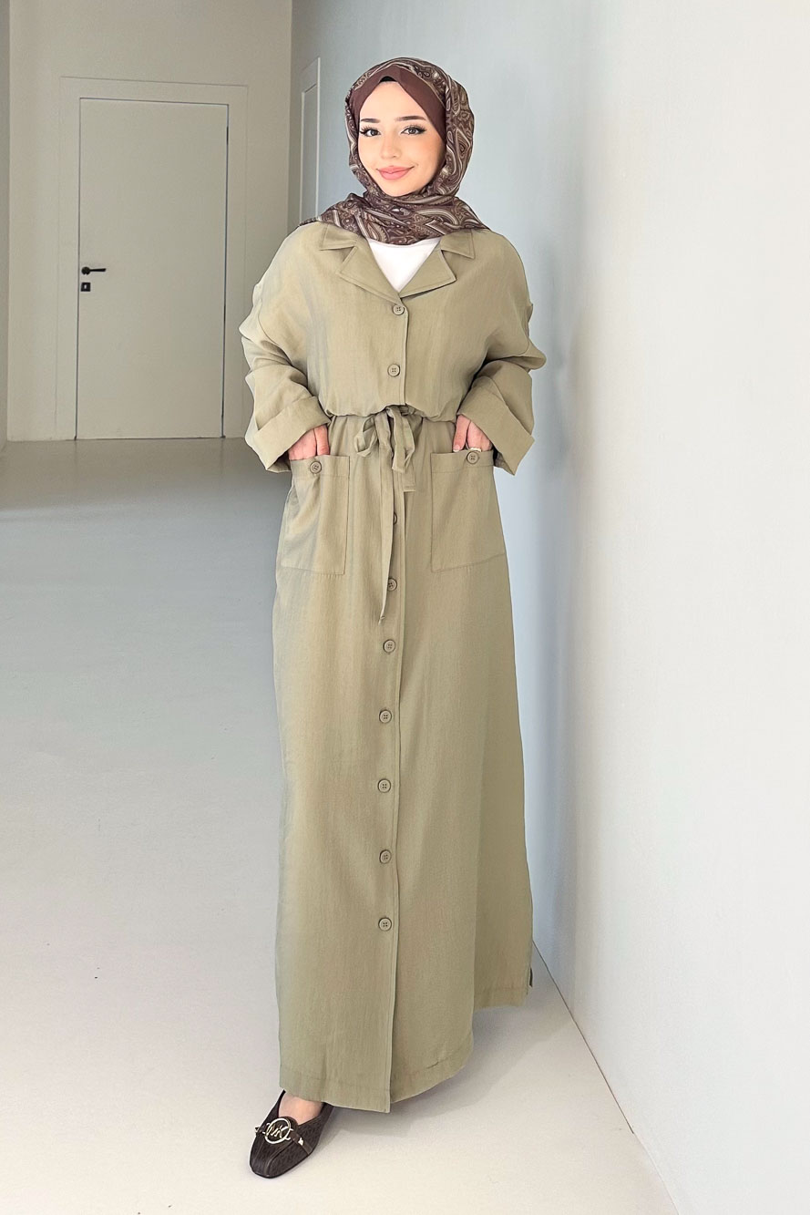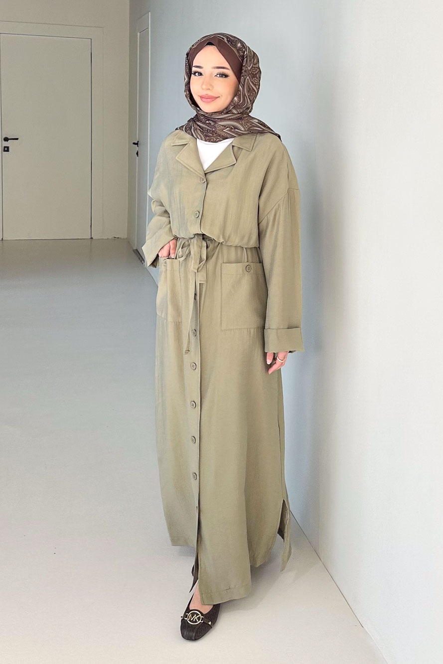 Tam boy düğmeli gömlek formu klasik ve zarif bir görünüm sağlar. Bel kısmındaki tünel ve büzgü detayı sayesinde vücuda göre ayarlanabilir ve estetik bir siluet oluşturur. Cep detayları tasarıma hem şıklık hem de kullanışlılık kazandırır. Oversize kalıbı sayesinde modern ve rahat bir duruş sunar. Manken üzerinde oversize bedendir.