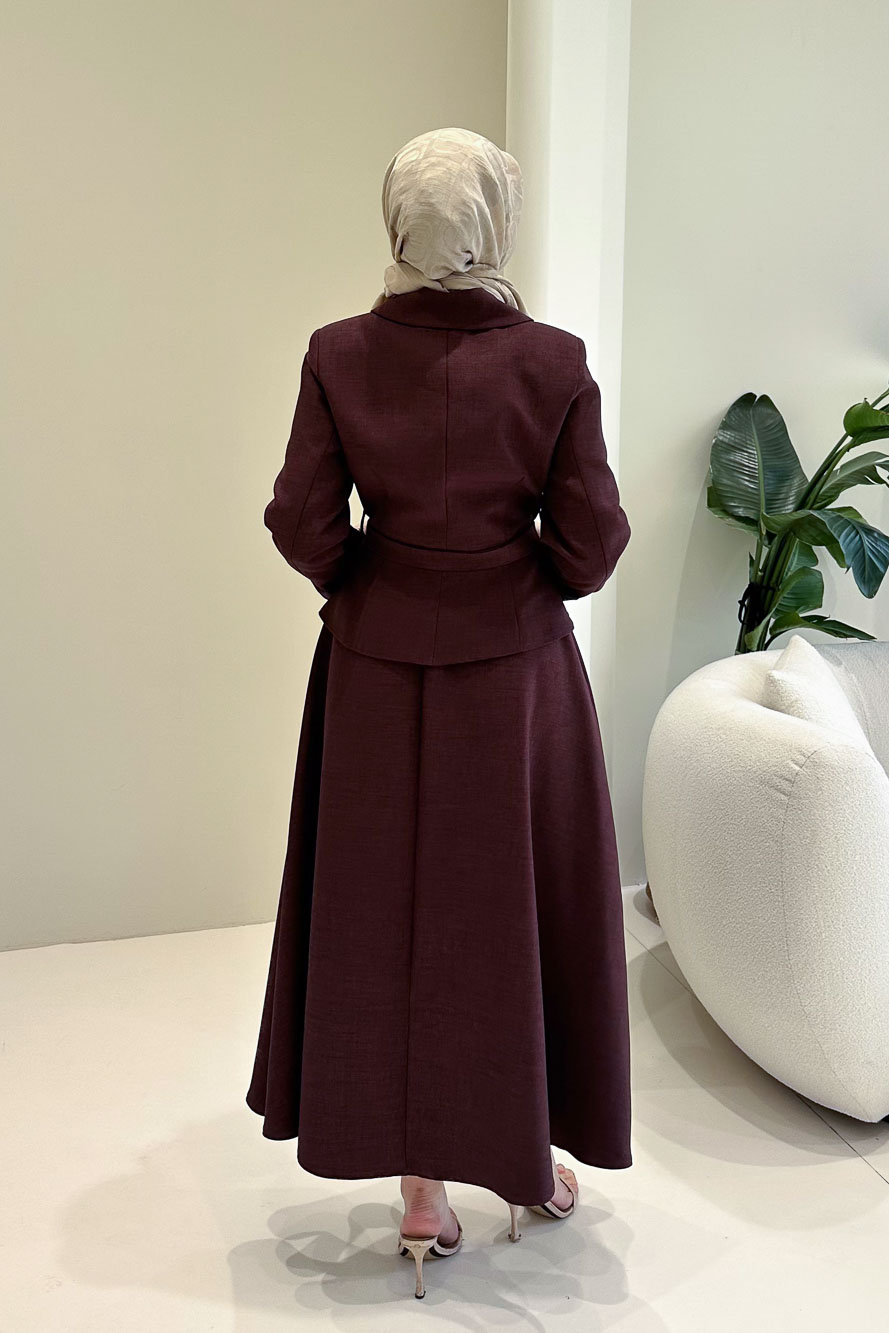 Ceketi astarlıdır ve tam düğmelidir. Çıkabilen kemer detayı bulunmaktadır. Etek beli yarım lastiklidir. Manken üzerinde S bedendir.