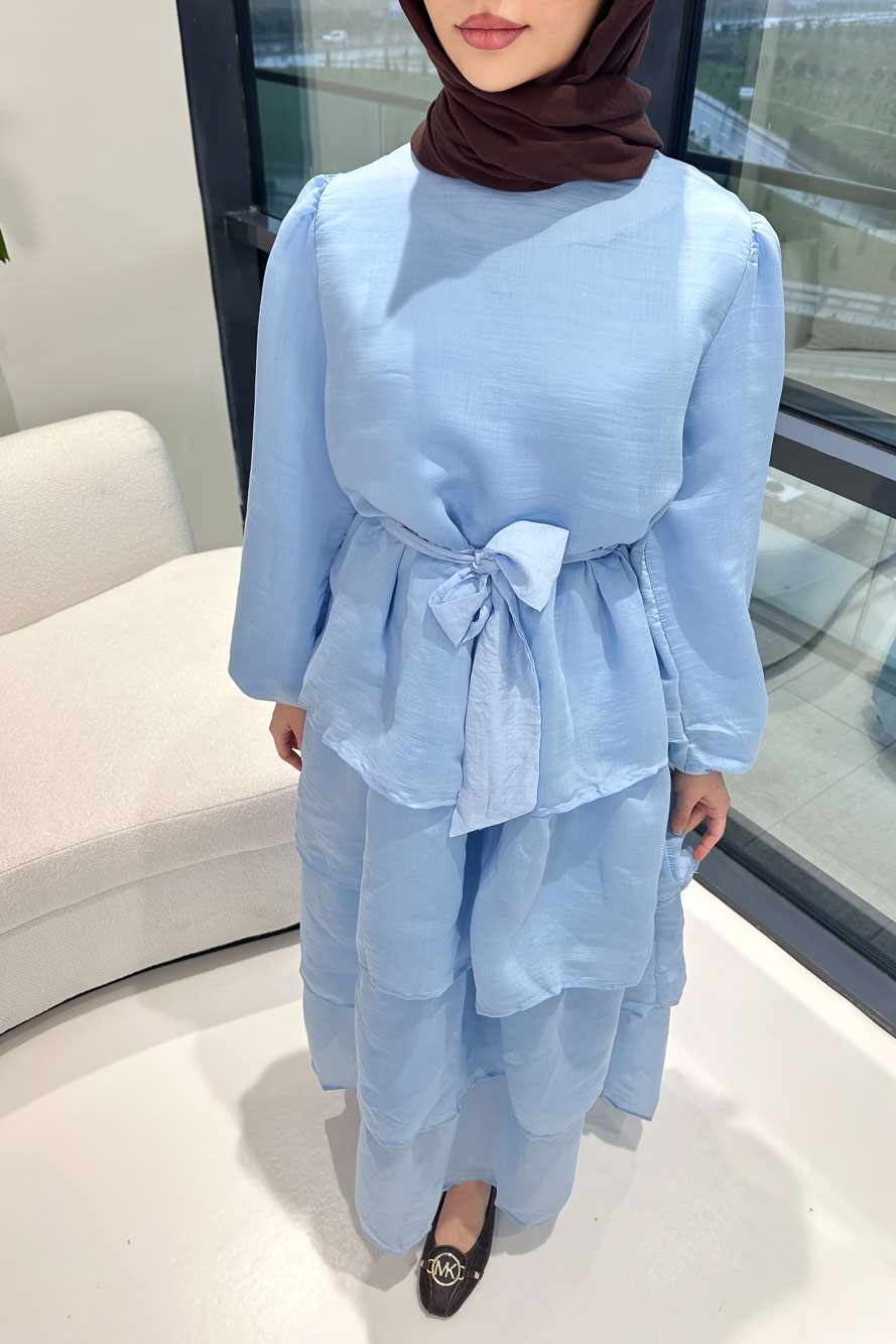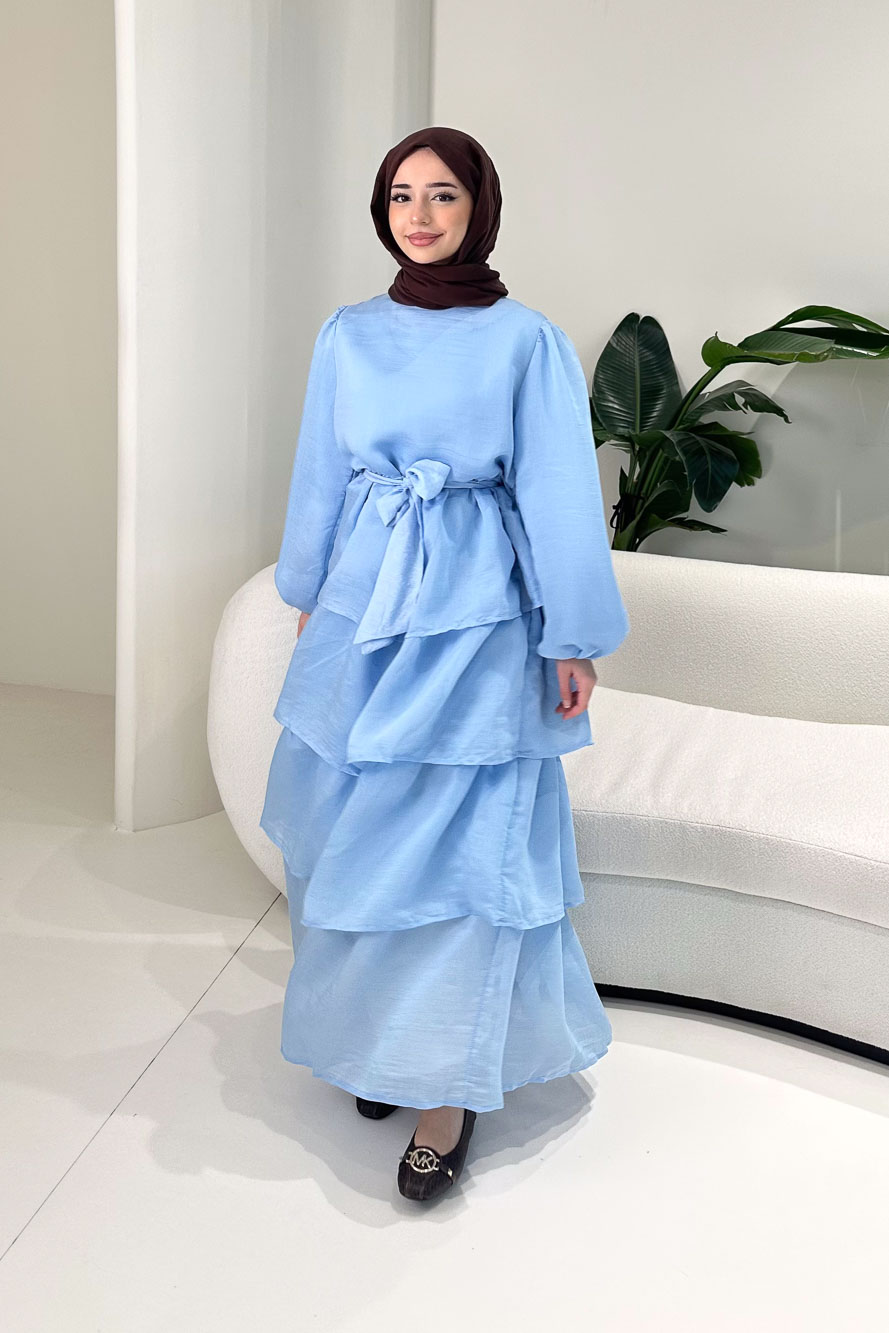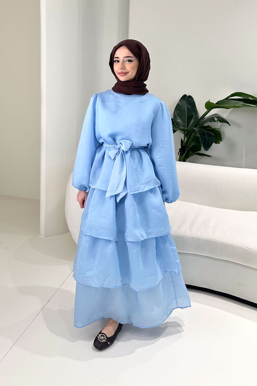 Eteğindeki kat kat tül detayları elbiseye hareketli ve dikkat çekici bir görünüm kazandırır. Kolları lastiklidir ve rahat kullanım sağlar. Tam astarlı yapısı sayesinde iç göstermez. Kemer detayı ile bel vurgusu yapılabilir. Manken üzerinde 1 bedendir.