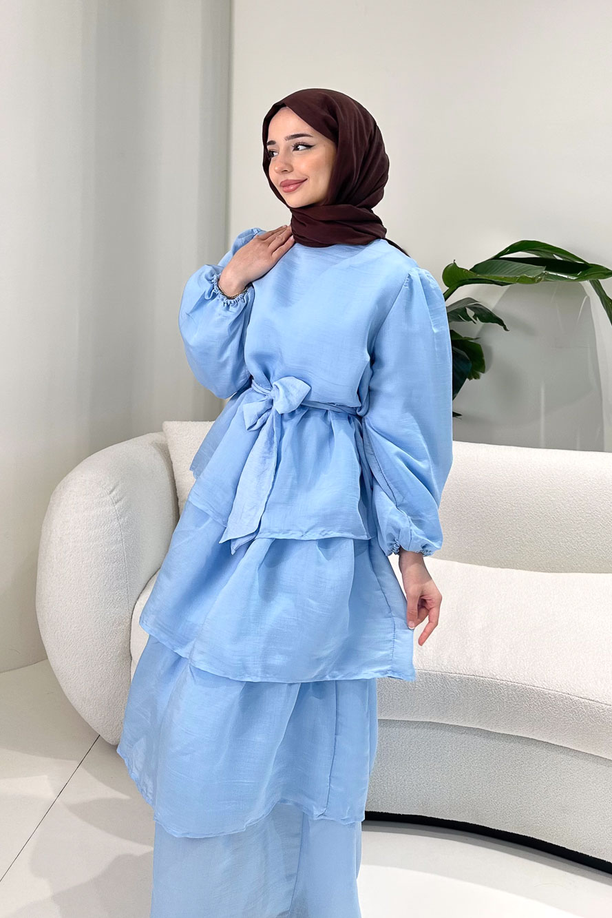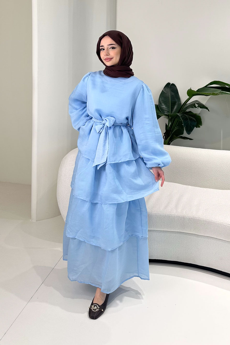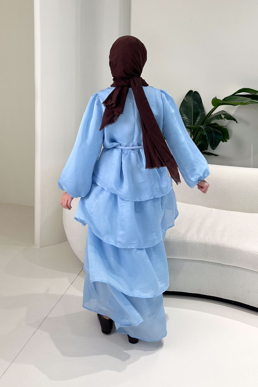 Eteğindeki kat kat tül detayları elbiseye hareketli ve dikkat çekici bir görünüm kazandırır. Kolları lastiklidir ve rahat kullanım sağlar. Tam astarlı yapısı sayesinde iç göstermez. Kemer detayı ile bel vurgusu yapılabilir. Manken üzerinde 1 bedendir.