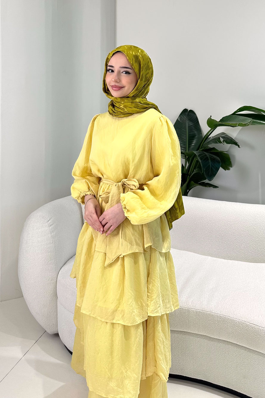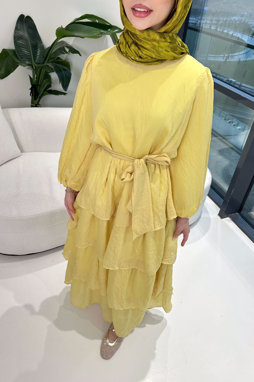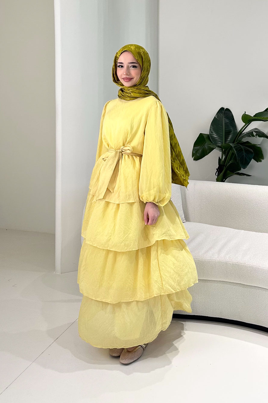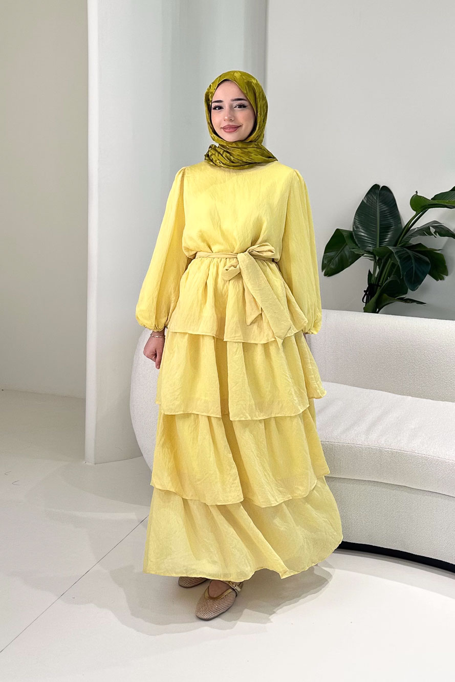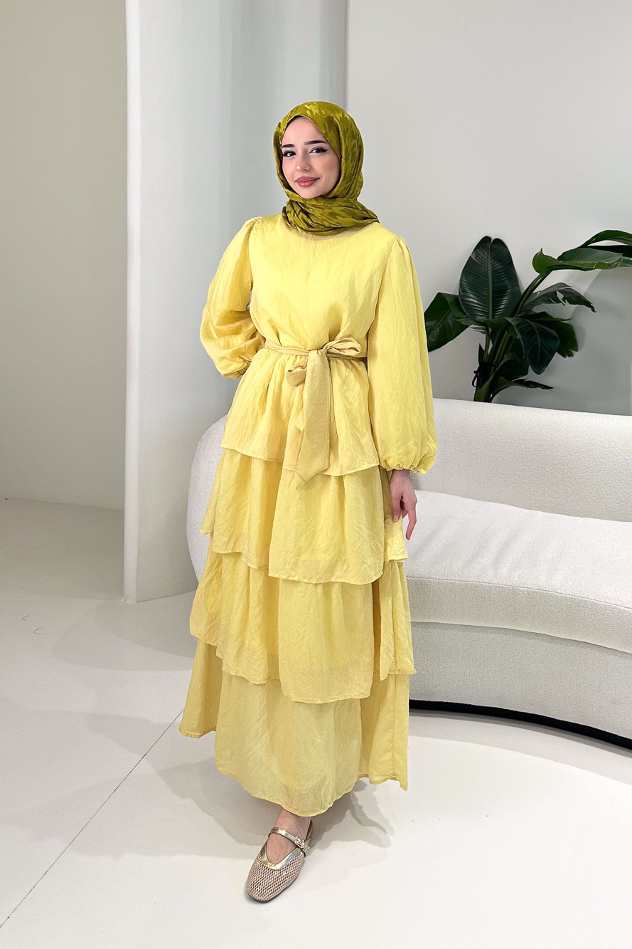 Eteğindeki kat kat tül detayları elbiseye hareketli ve dikkat çekici bir görünüm kazandırır. Kolları lastiklidir ve rahat kullanım sağlar. Tam astarlı yapısı sayesinde iç göstermez. Kemer detayı ile bel vurgusu yapılabilir. Manken üzerinde 1 bedendir.