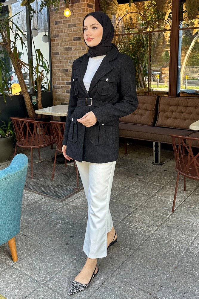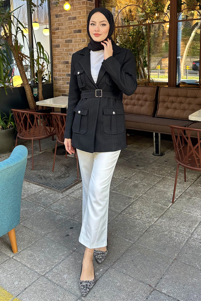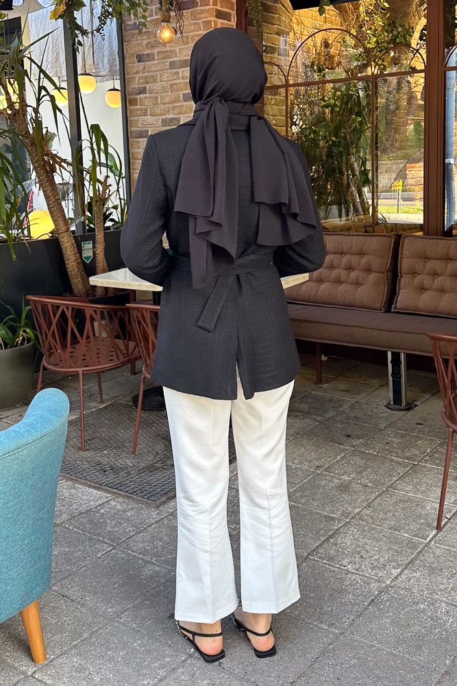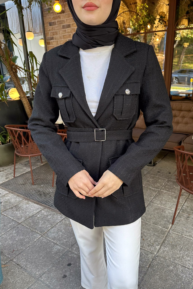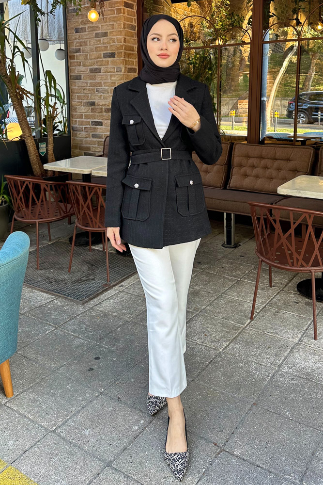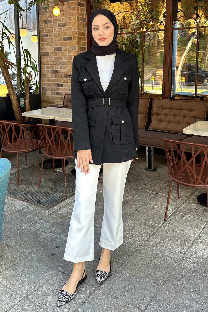 Kumaş: Tüvit Kalıp: Regular Uzunluk: 75 cm S Beden Göğüs Ölçüsü: 90 cm *seyyar kemeri vardır. **Astarlıdır.