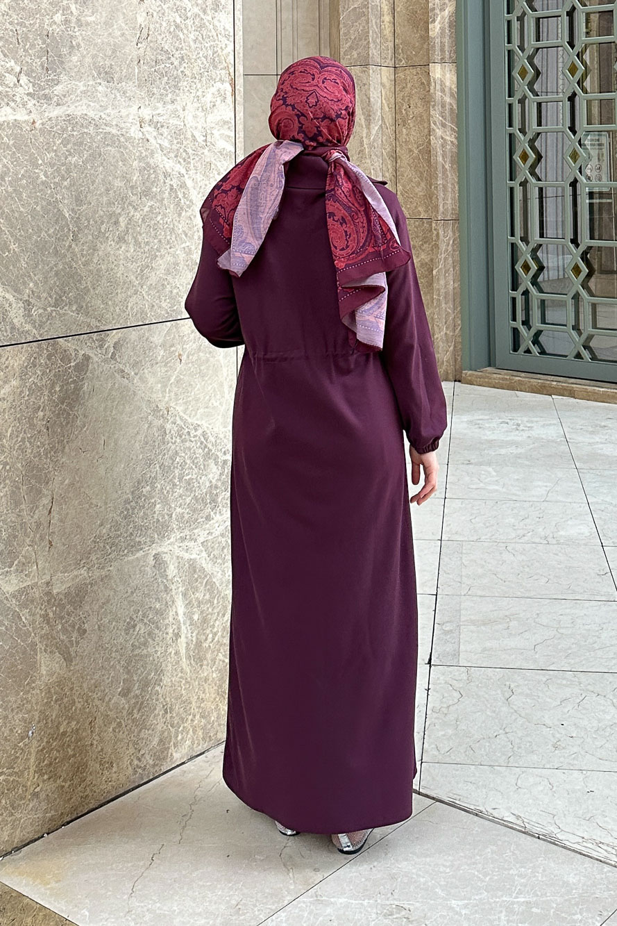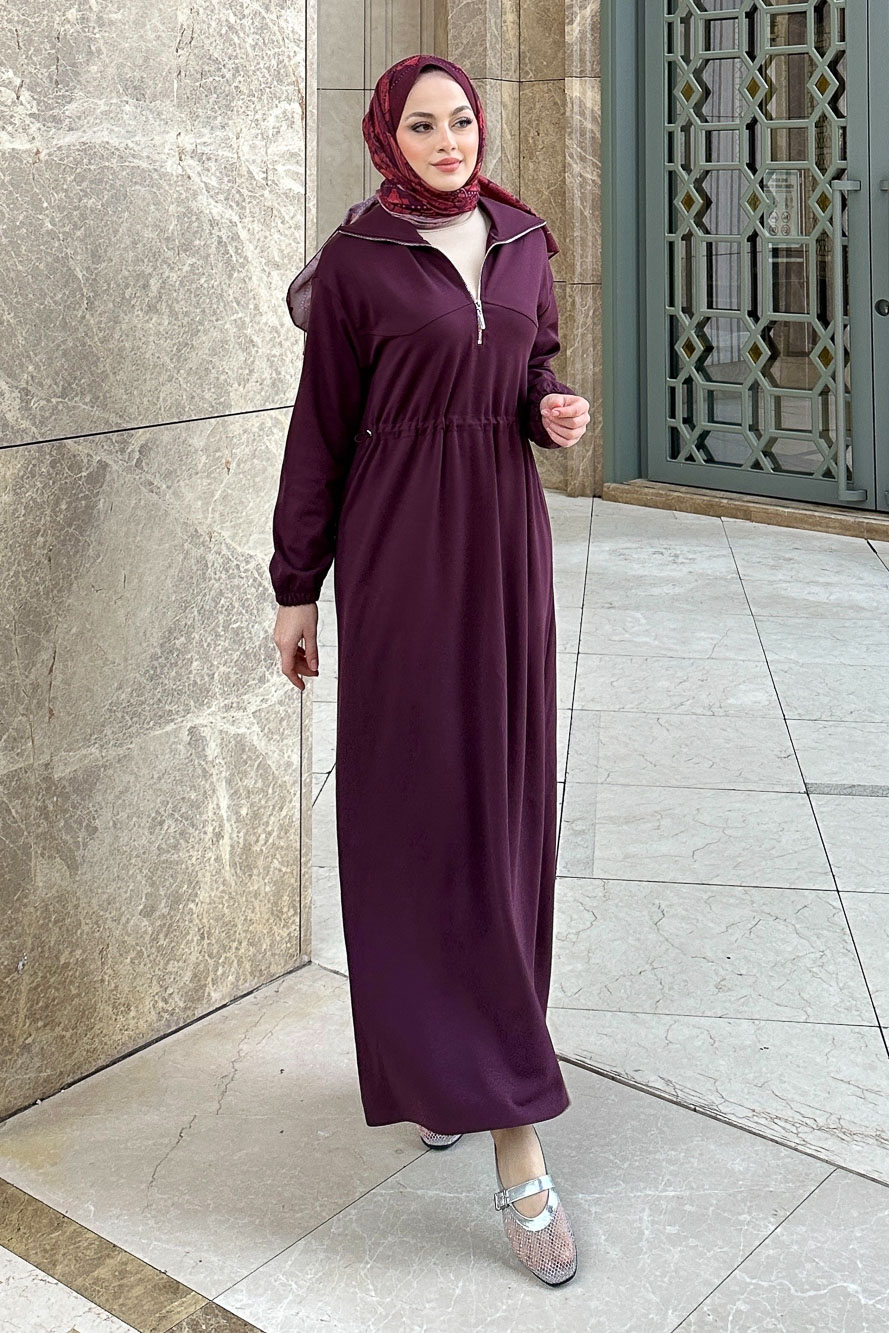 Kesik Detaylı Fermuarlı Yakalı Elbise - Bordo