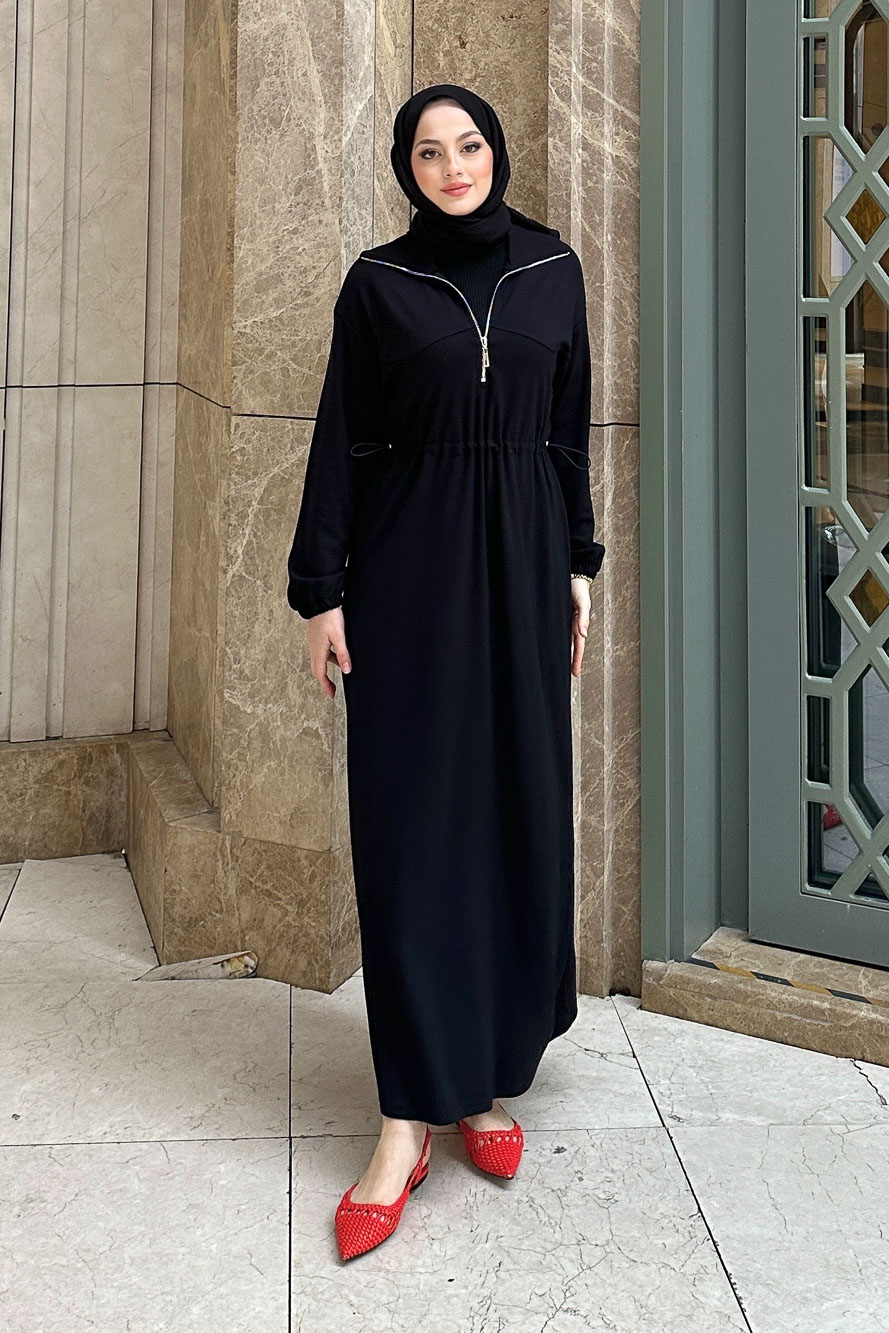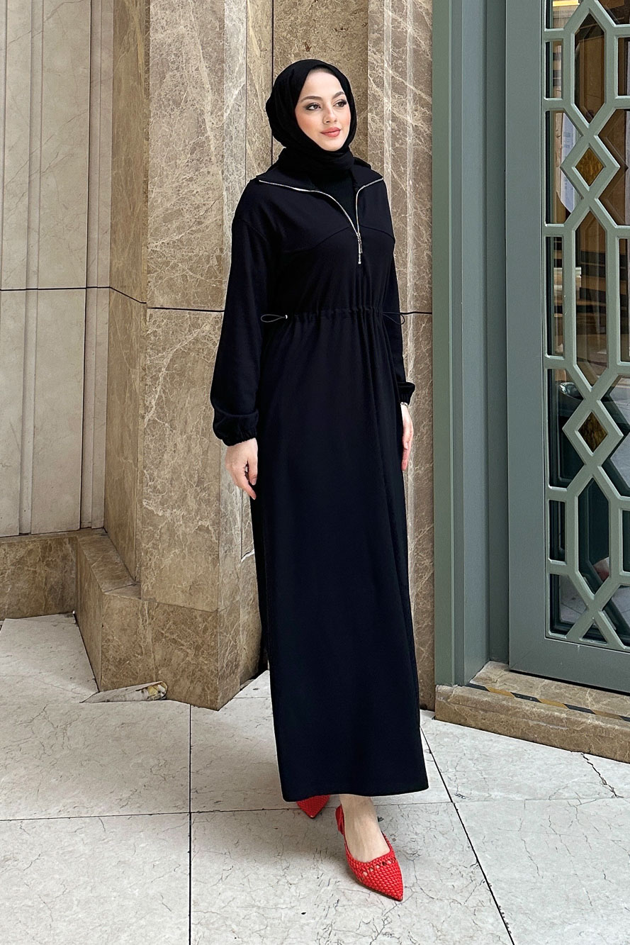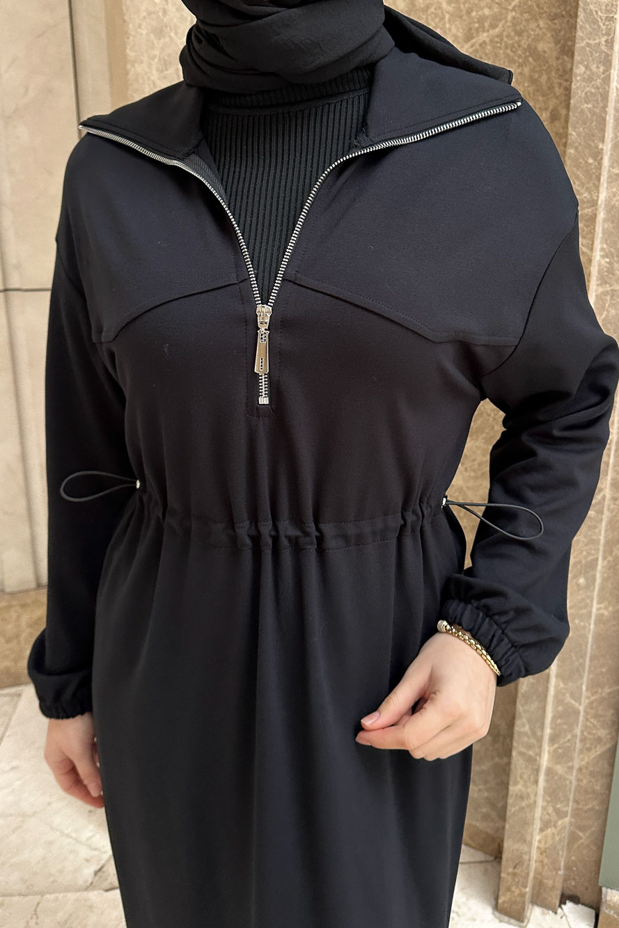 Kesik Detaylı Fermuarlı Yakalı Elbise - Siyah