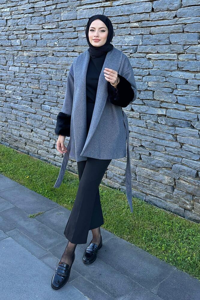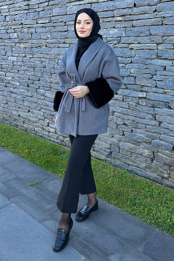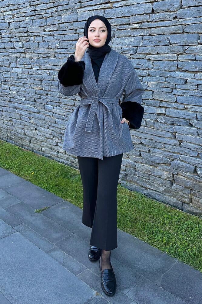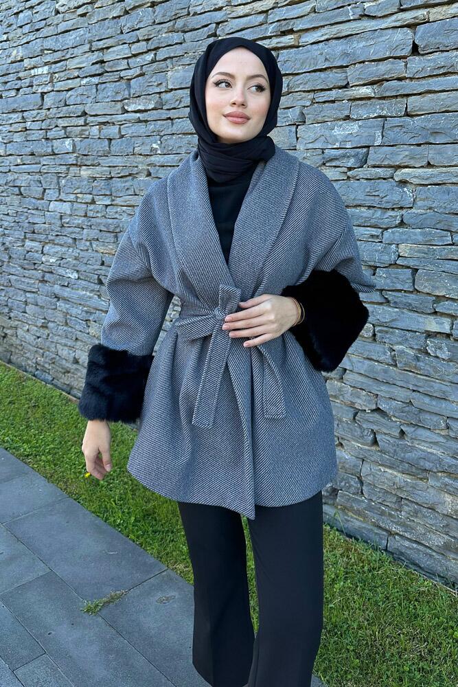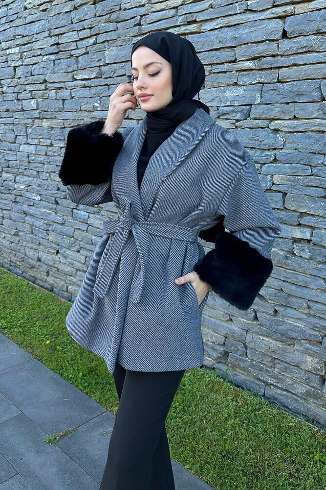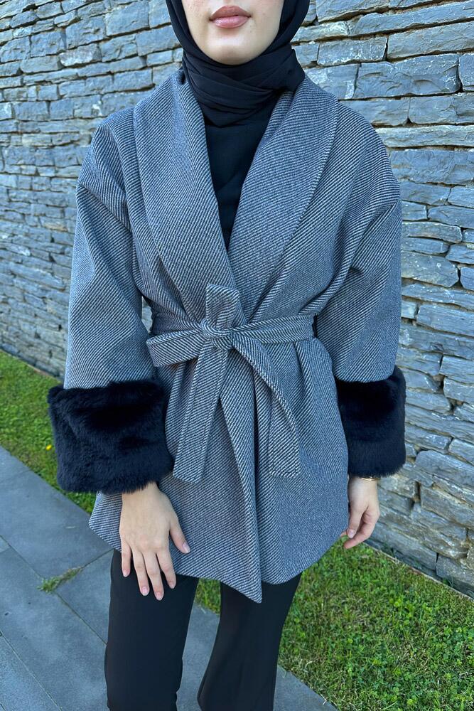 Kolu Kürklü Çizgili Kaşe Kaban - Siyah