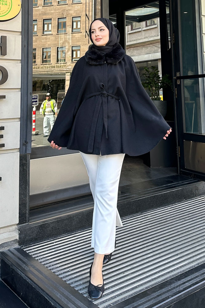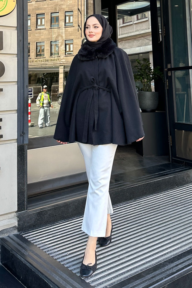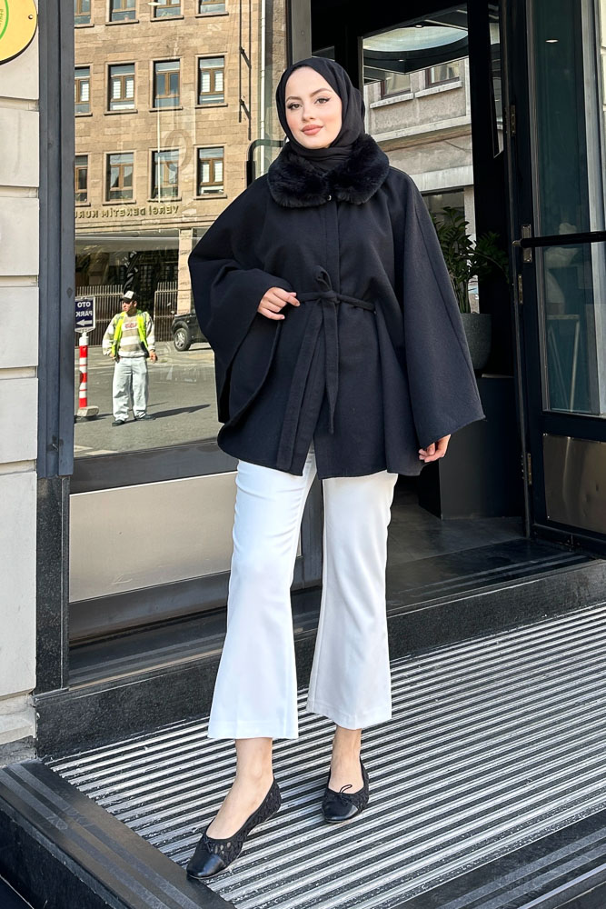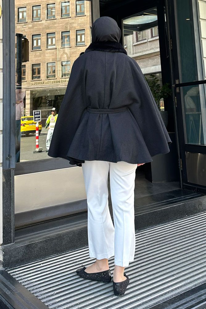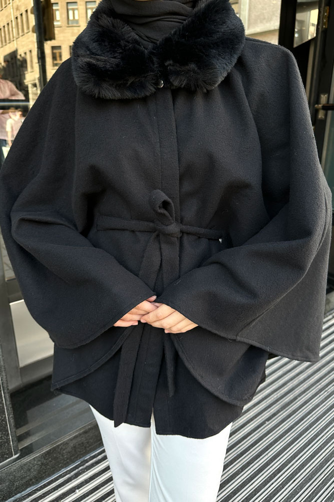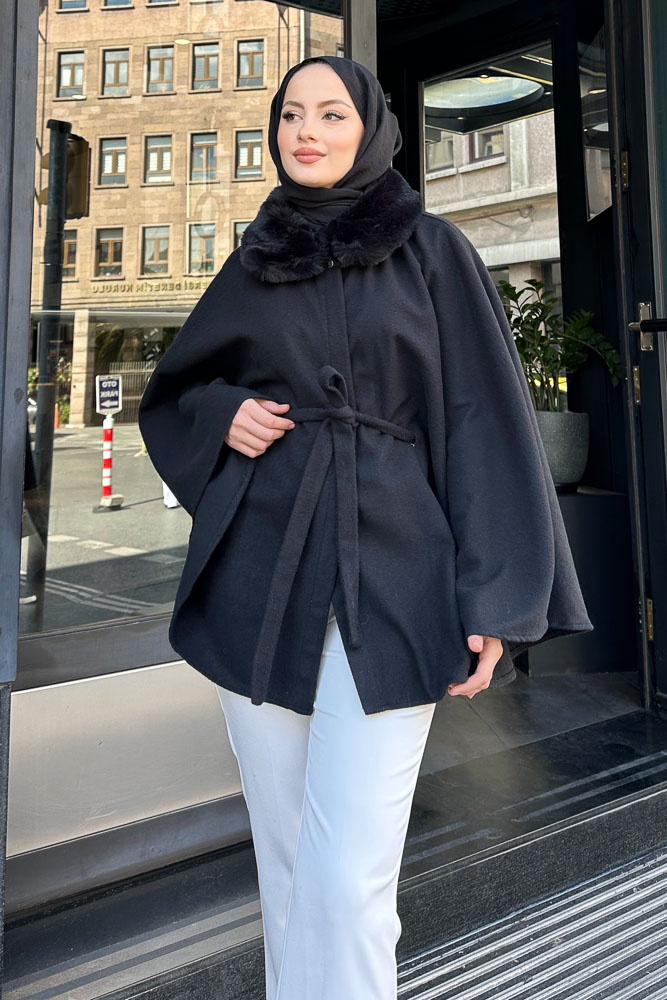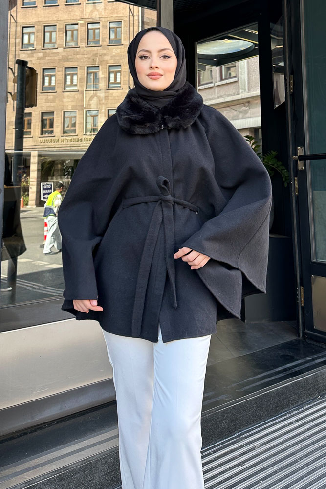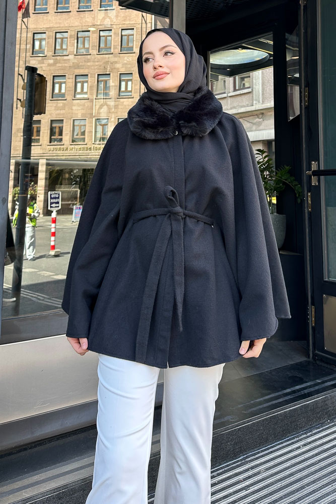 Kolu Kürklü Çizgili Kaşe Kaban - Siyah