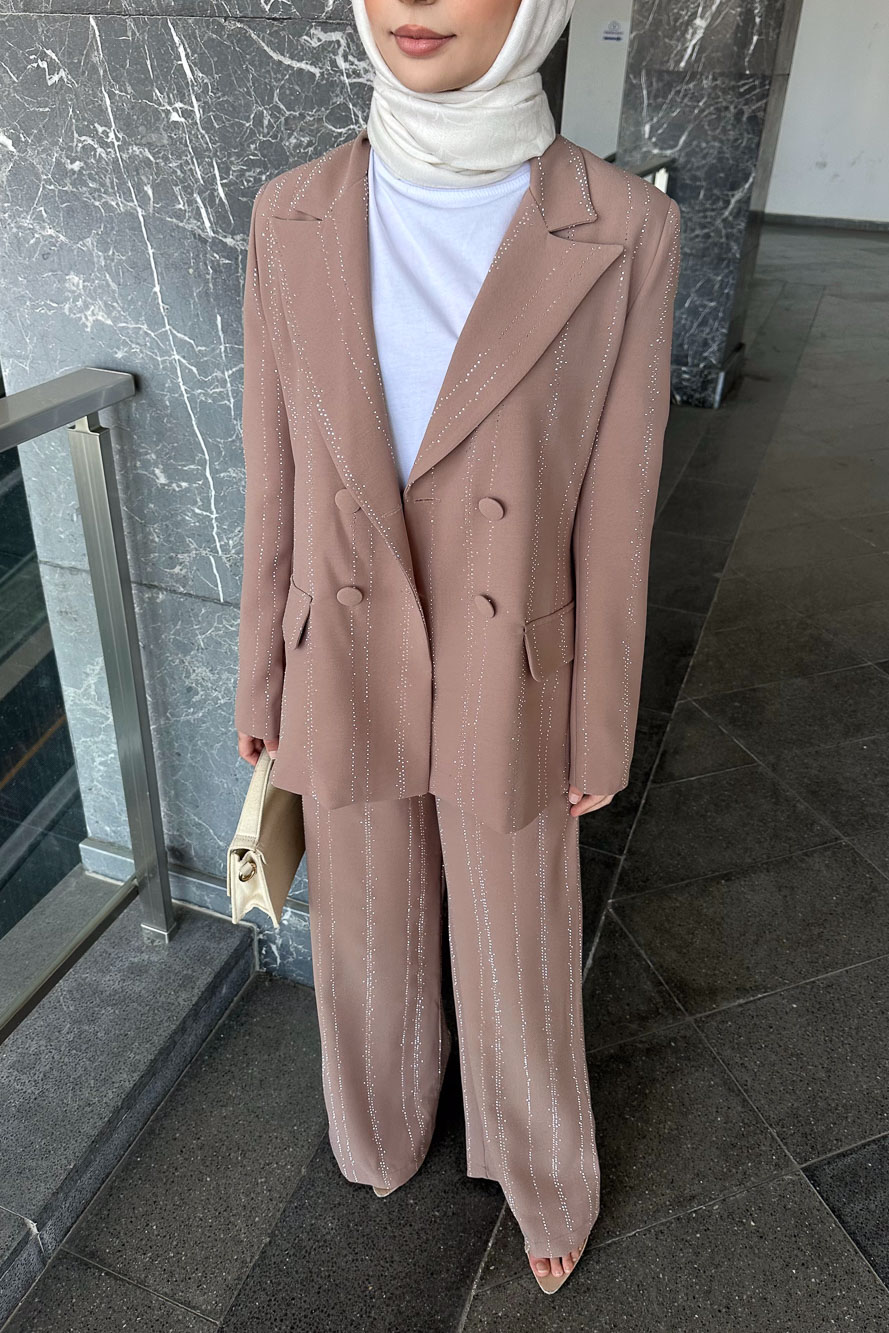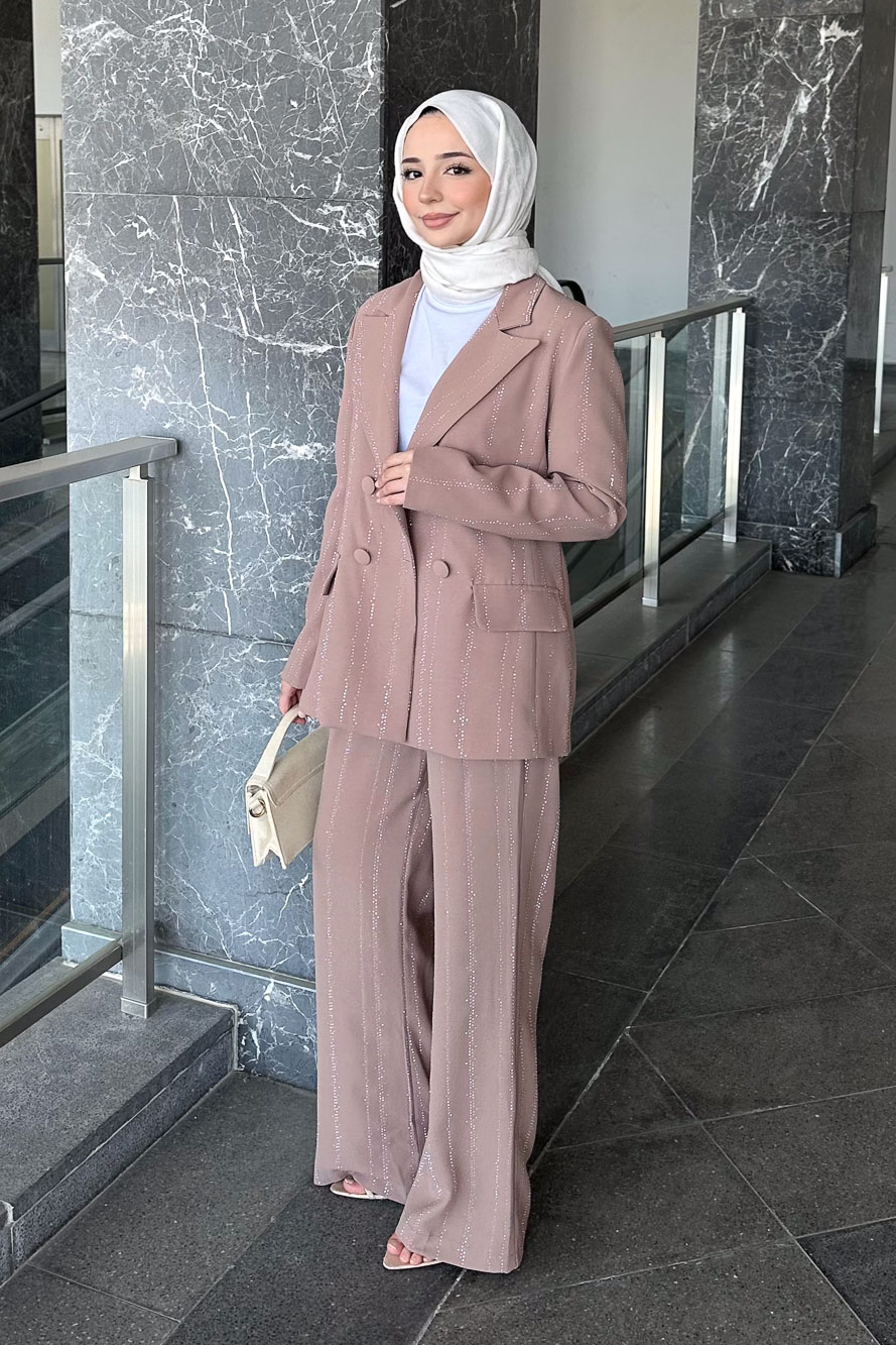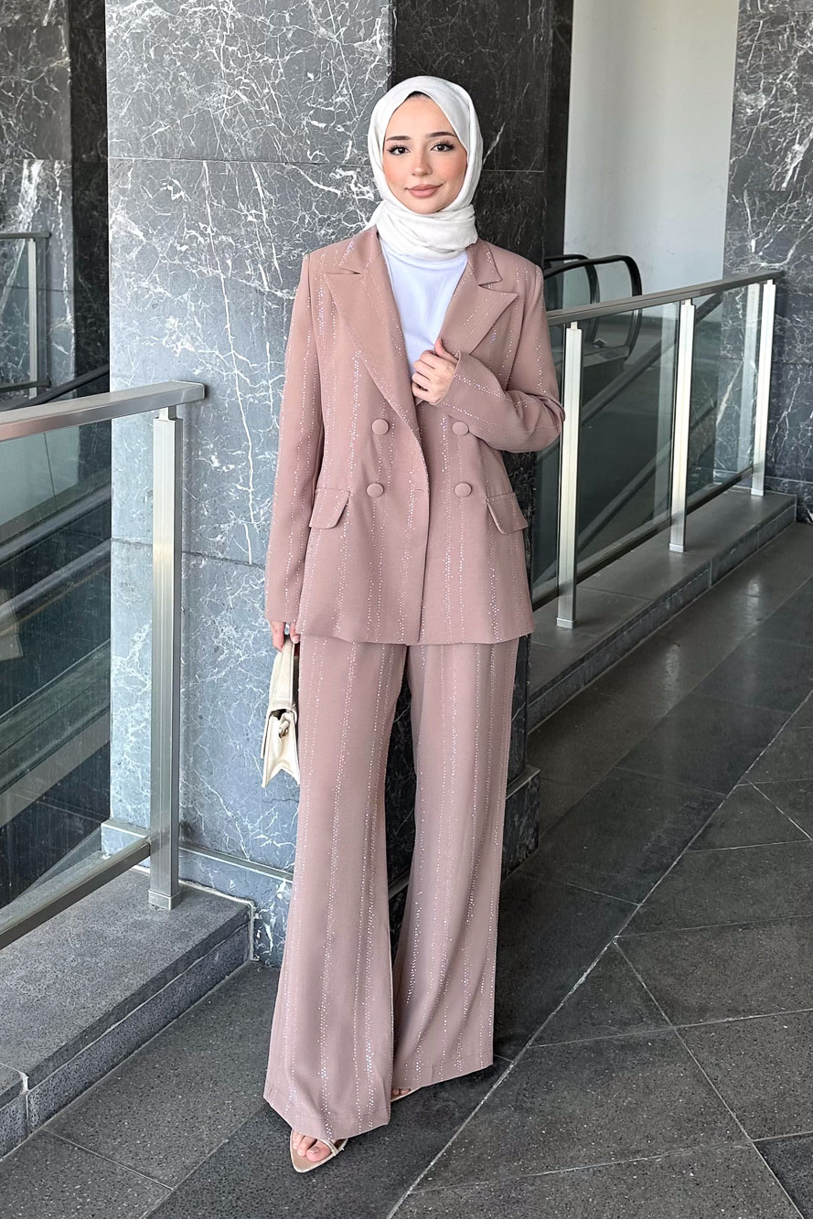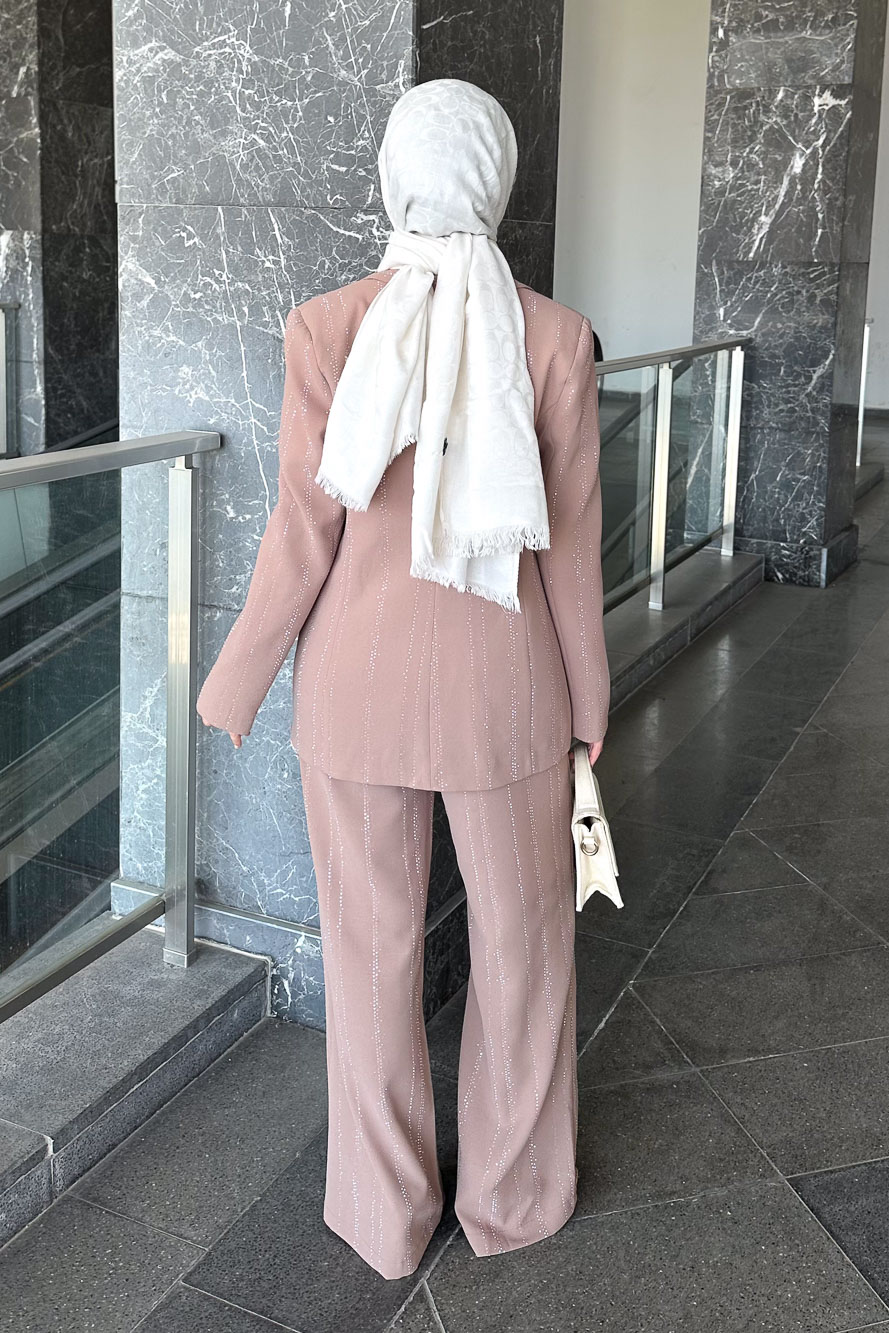 Ceket üzerindeki taş detayları takıma ışıltılı ve dikkat çekici bir görünüm kazandırır. Astarlı yapısı ile daha kaliteli bir duruş sunar. Pantolonun tam lastikli beli rahatlık sağlarken, cep görünümlü ceket detayı tasarıma modern bir hava katar. Hem özel günlerde hem şık kombinlerde rahatlıkla tercih edilebilir.