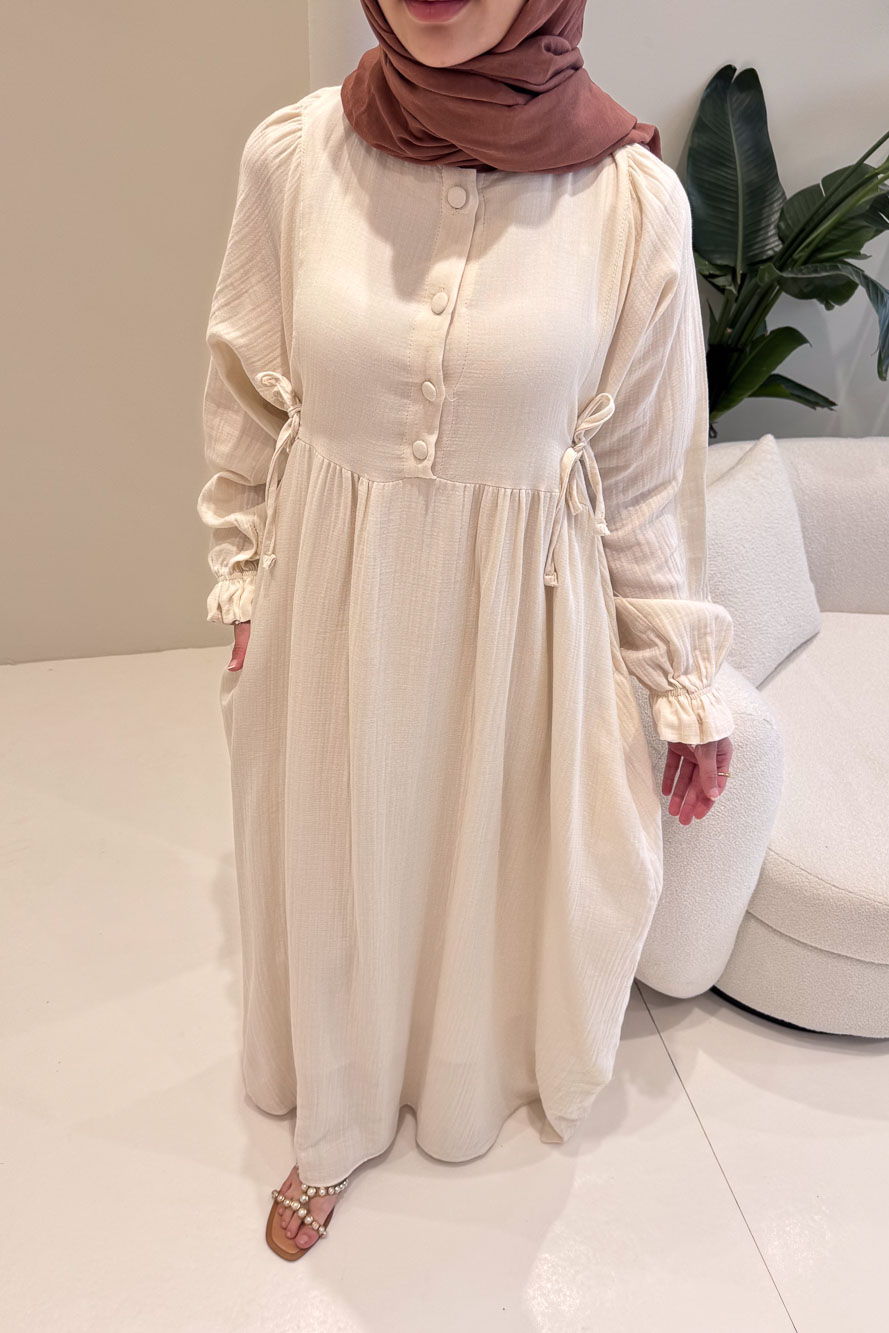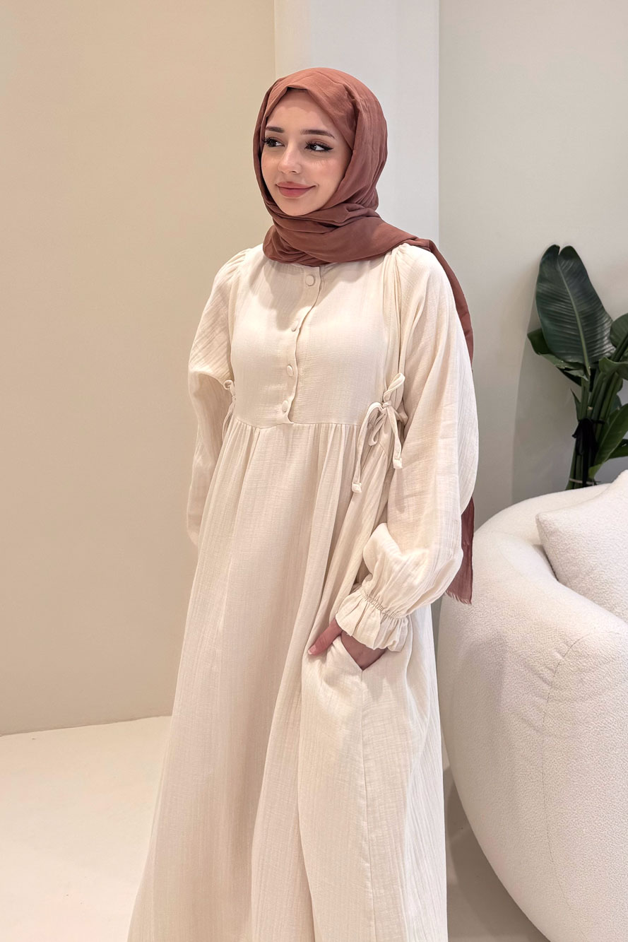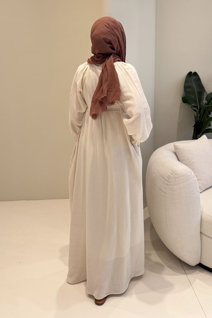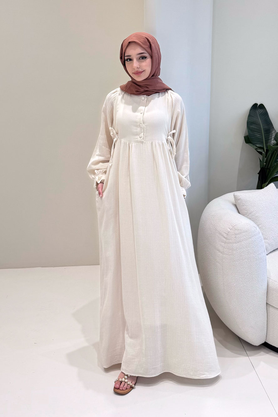 Hafif ve nefes alan müslin dokusuyla yaz aylarında konforlu ve zarif bir görünüm sunar.