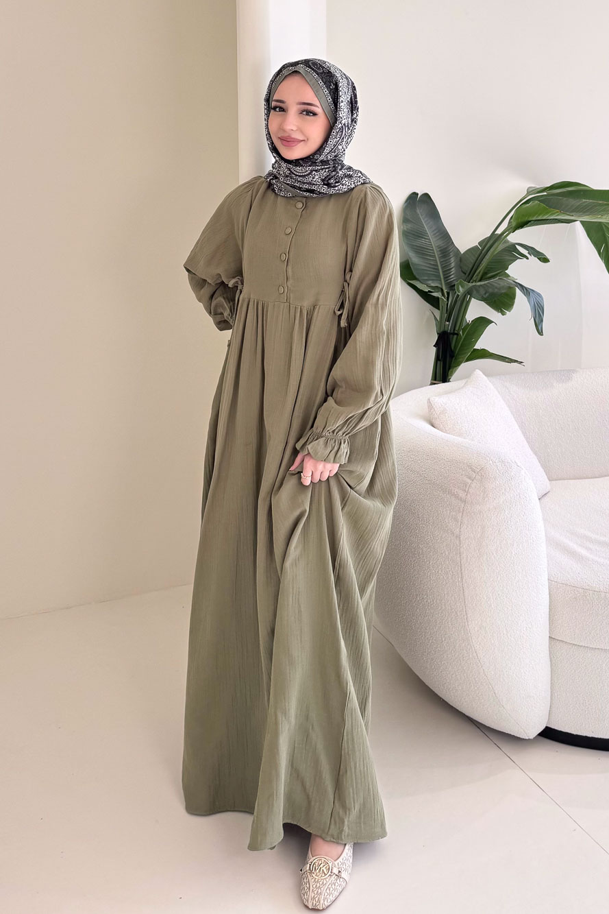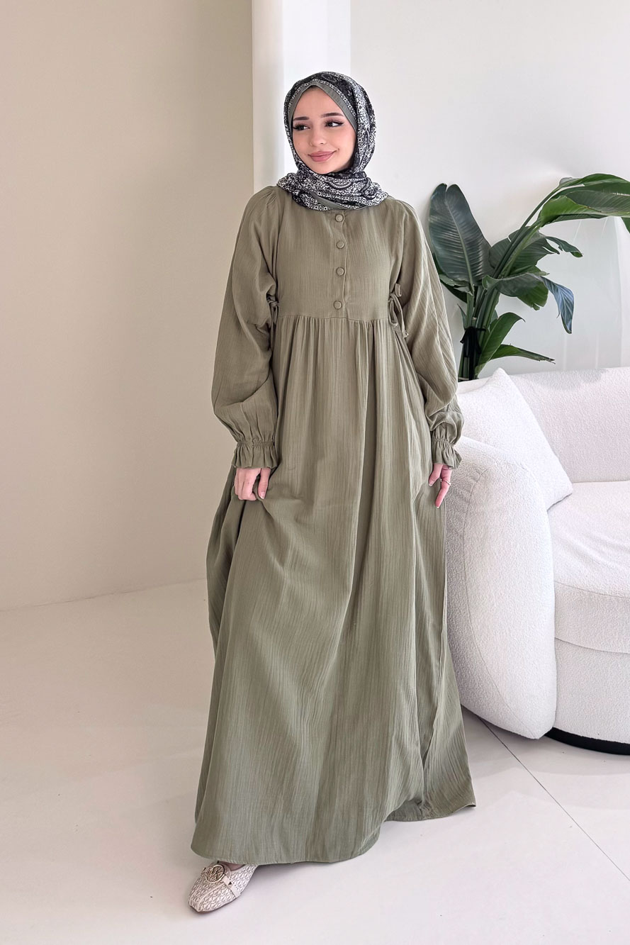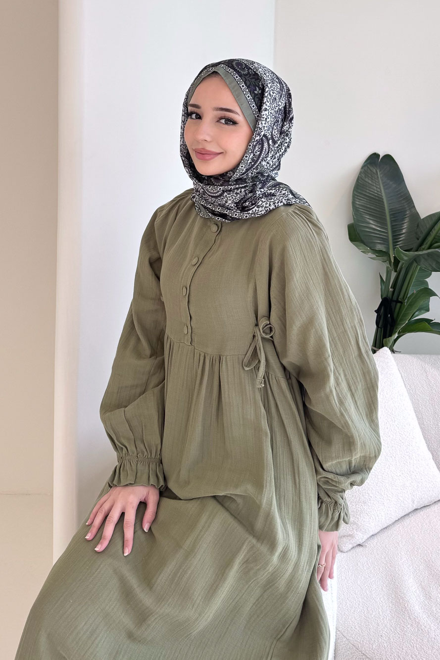 Liorena Yandan Bağlamalıi Müslin Elbise - Haki