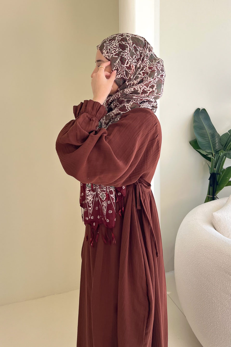 Liorena Yandan Bağlamalıi Müslin Elbise - Kahverengi
