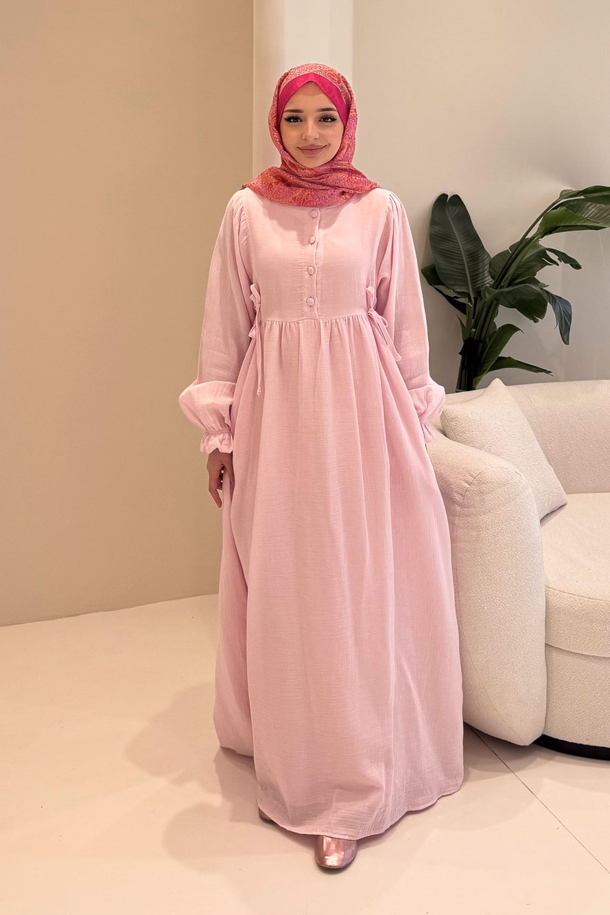 Hafif ve nefes alan müslin dokusuyla yaz aylarında konforlu ve zarif bir görünüm sunar.