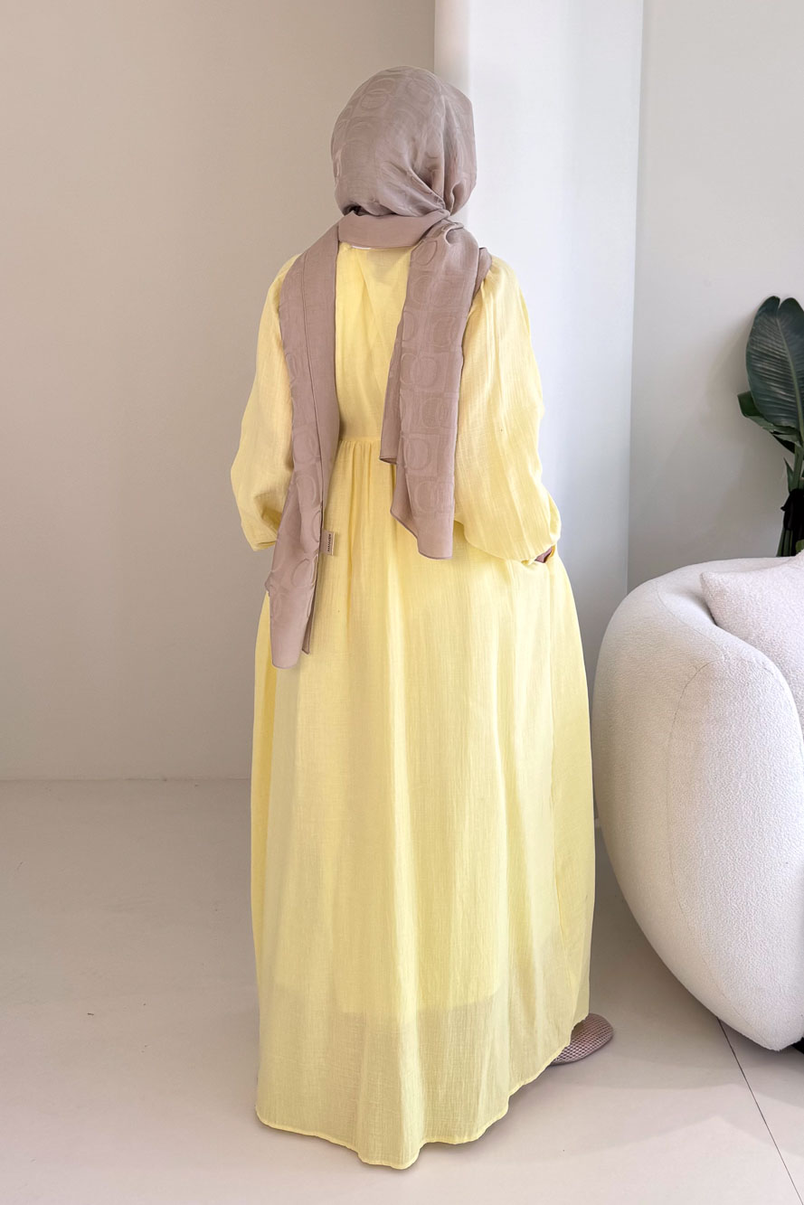 Hafif ve nefes alan müslin dokusuyla yaz aylarında konforlu ve zarif bir görünüm sunar.