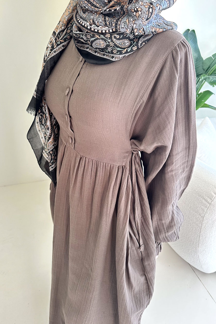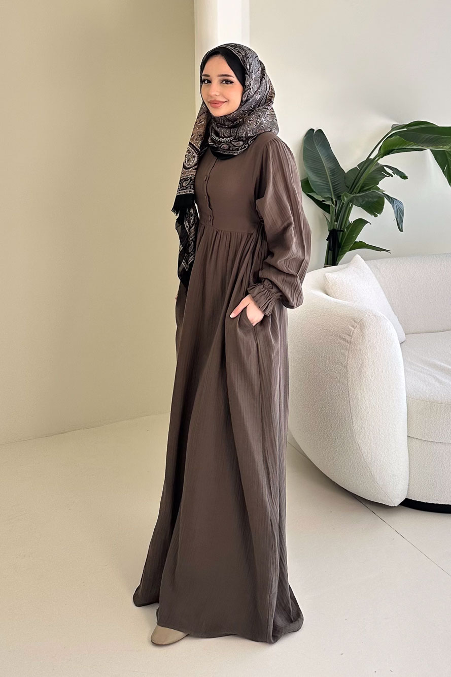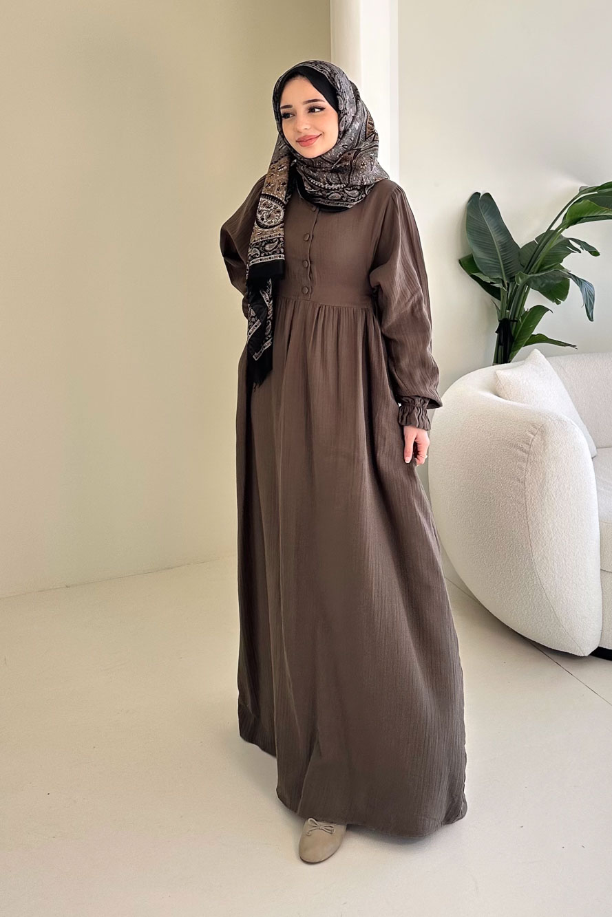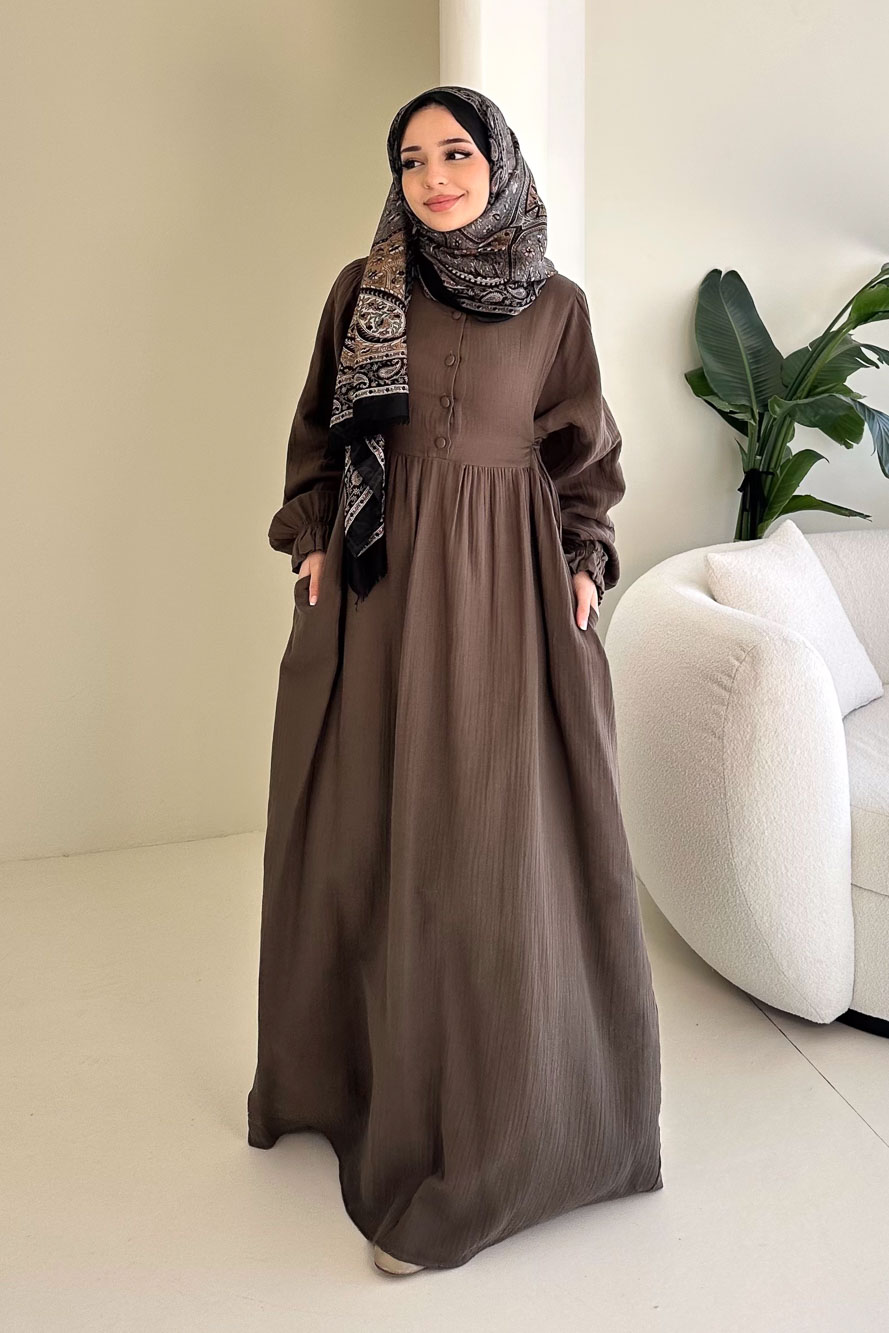 Hafif ve nefes alan müslin dokusuyla yaz aylarında konforlu ve zarif bir görünüm sunar.