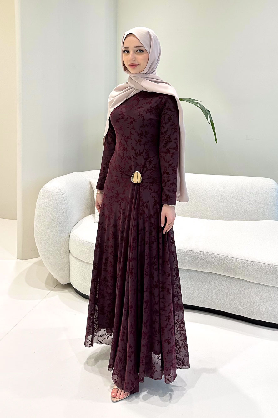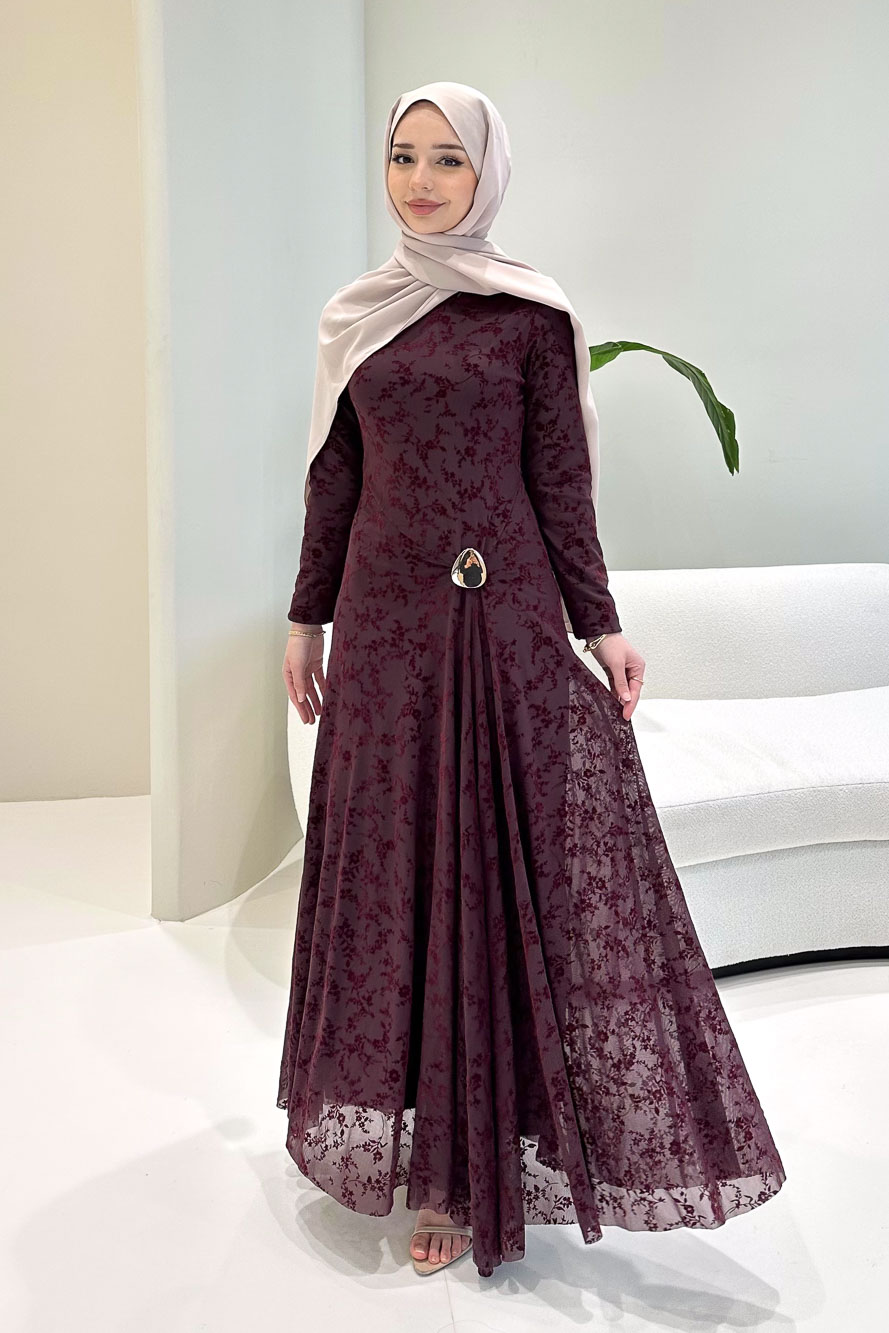 Lunera Flok Tül Broşlu Elbise - Mürdüm