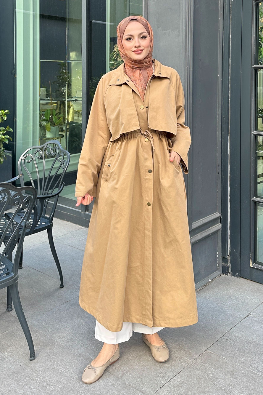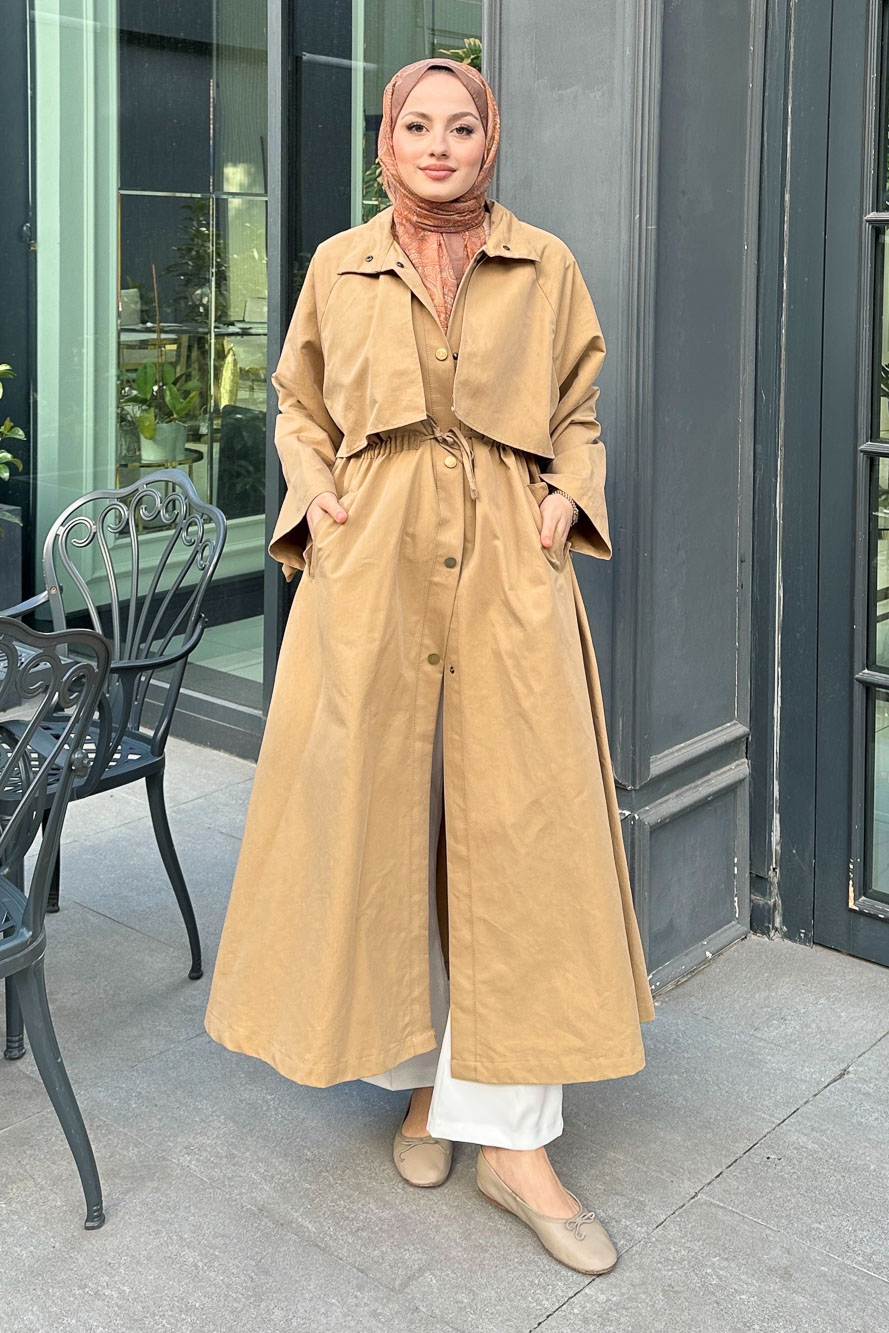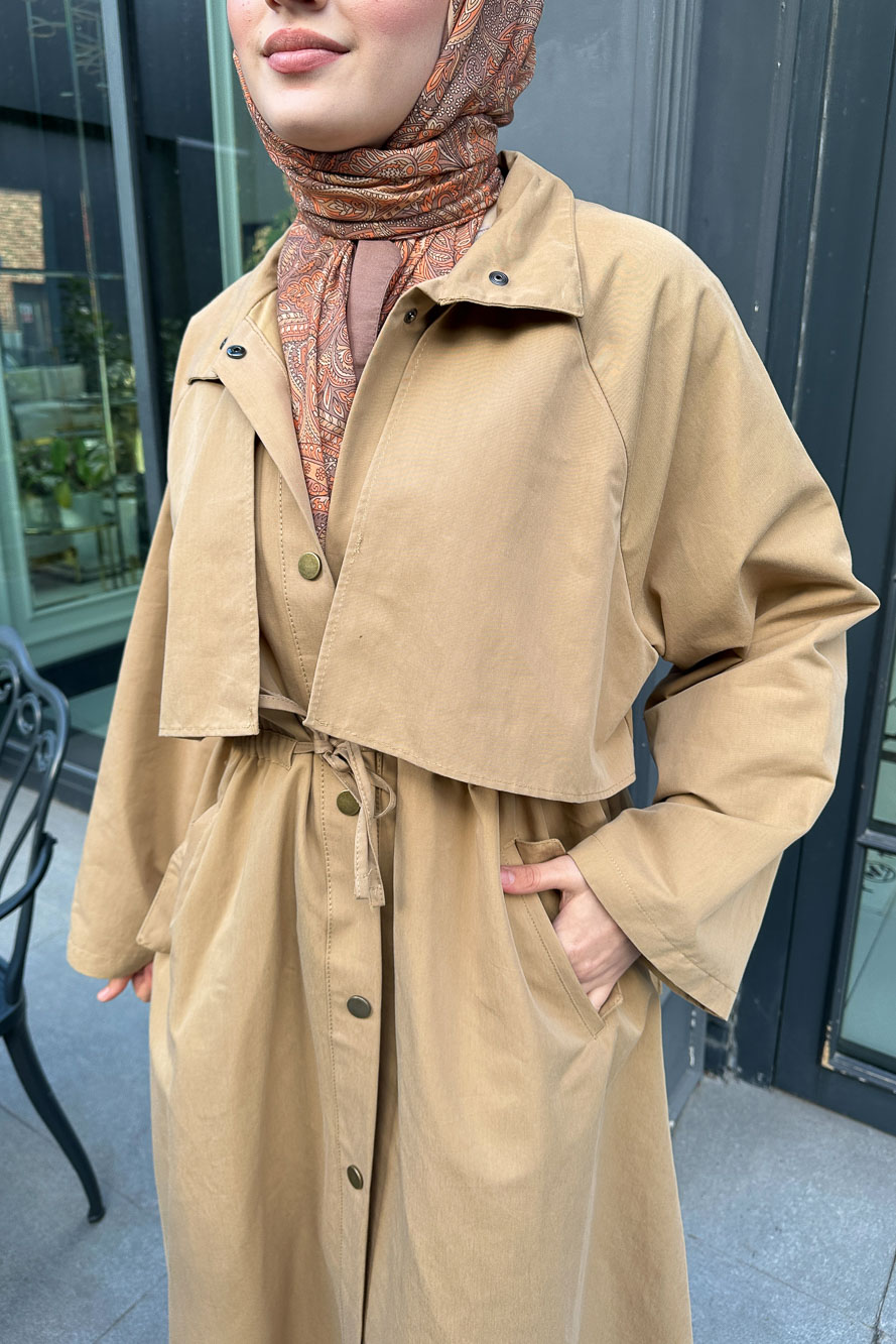 Lyon Beli Büzgülü Tam Boy Trençkot - Camel