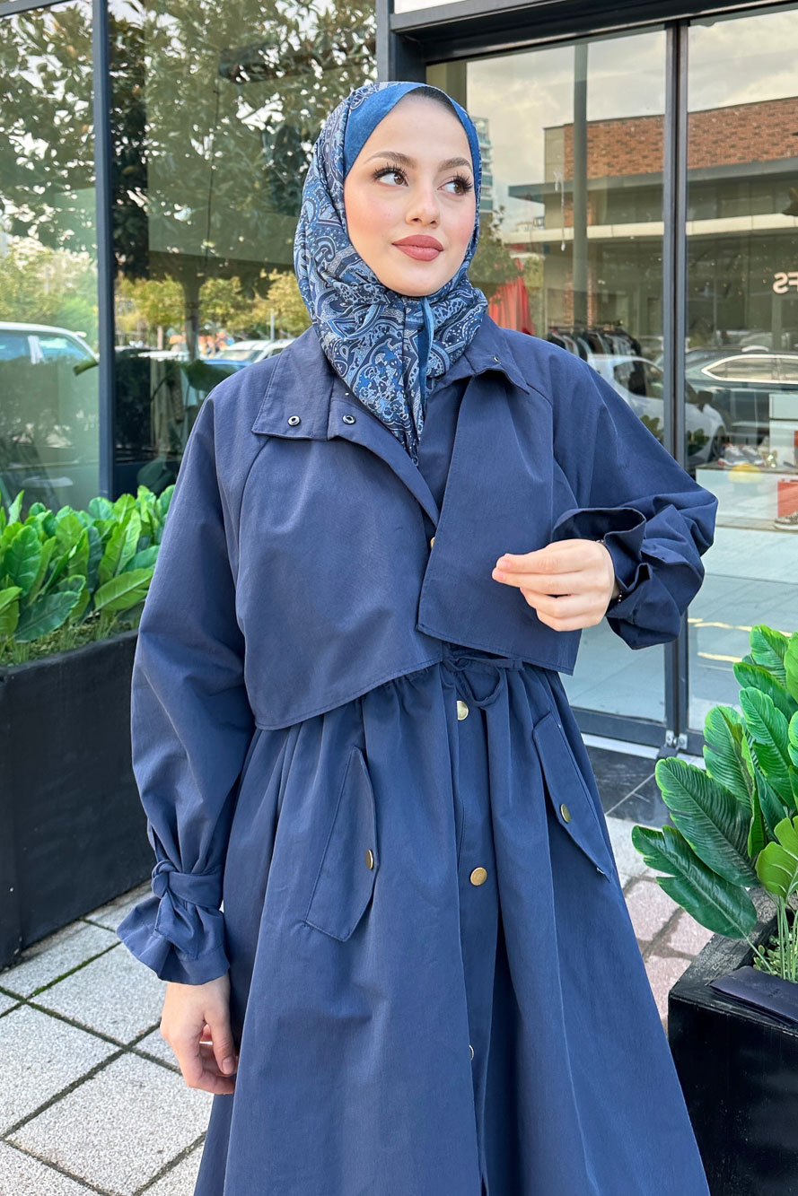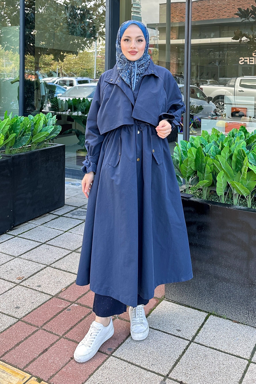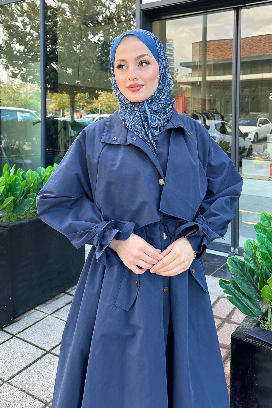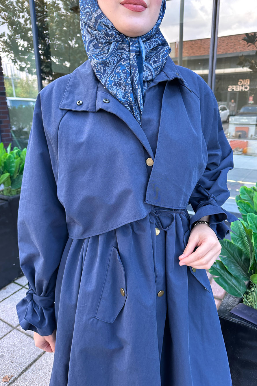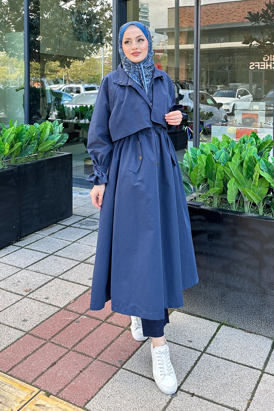 Lyon Beli Büzgülü Tam Boy Trençkot - Lacivert