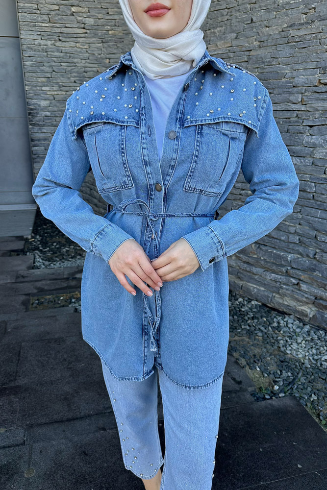 Marbella Taşlı Kemerli Ceket - Açık Mavi