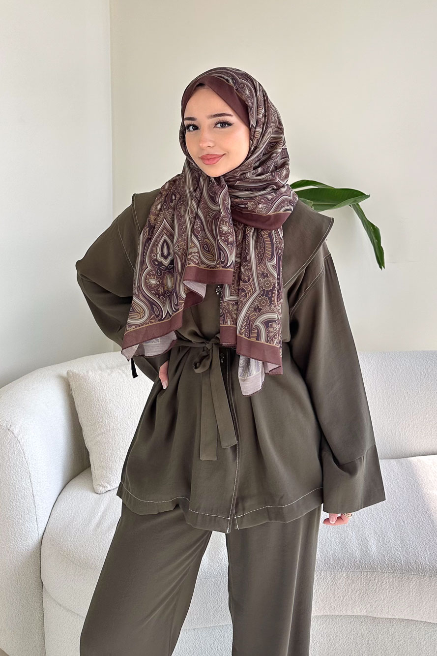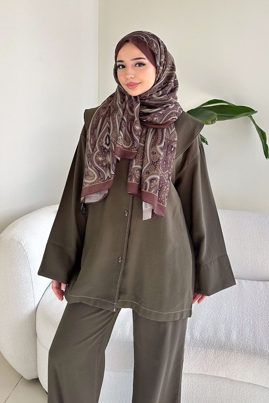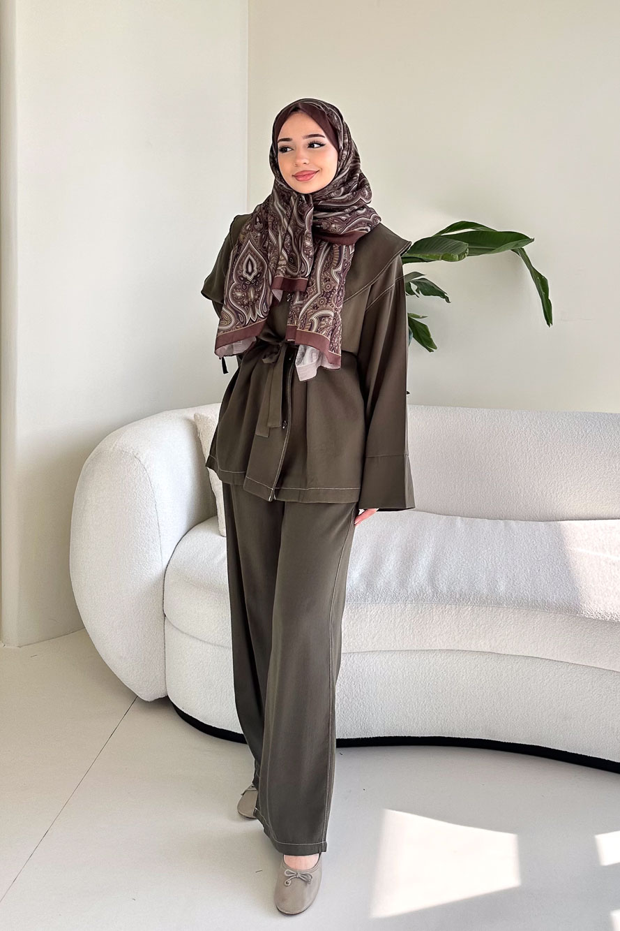 Üst kısmı önden düğmelidir ve mendil yaka formuna sahiptir. Pantolonu beli lastiklidir, ceplidir ve kemerlidir. Rahat kalıbıyla gün boyu konfor sağlar. Manken üzerinde SM bedendir.