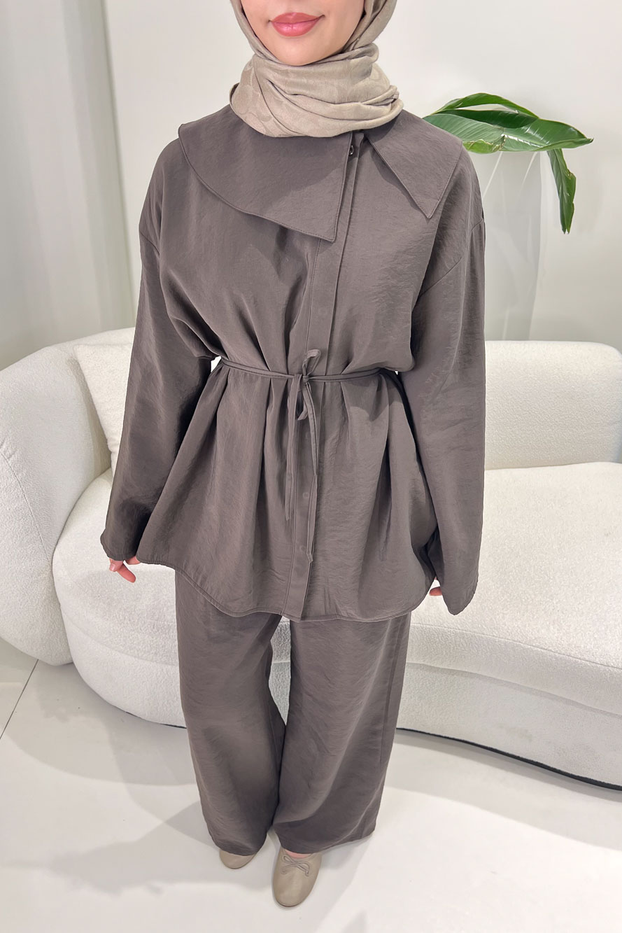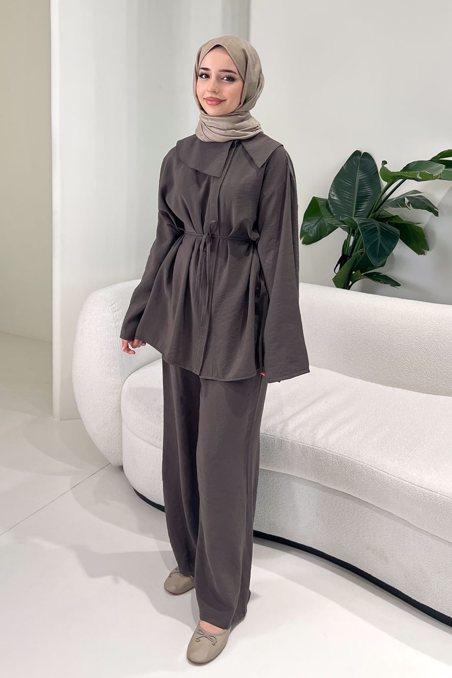 Mendil yaka detayı ile farklı ve sofistike bir görünüm sağlar. Üst kısmı gizli düğmelidir ve boydan lastikli yapısı ile rahat bir kullanım sunar. Pantolonun lastikli beli gün boyu konfor sağlarken, cepli tasarımı kullanım kolaylığı sunar. Seyyar kemeri ile bel vurgusu yapılabilir. Manken üzerinde SM bedendir.