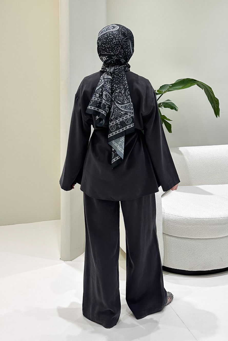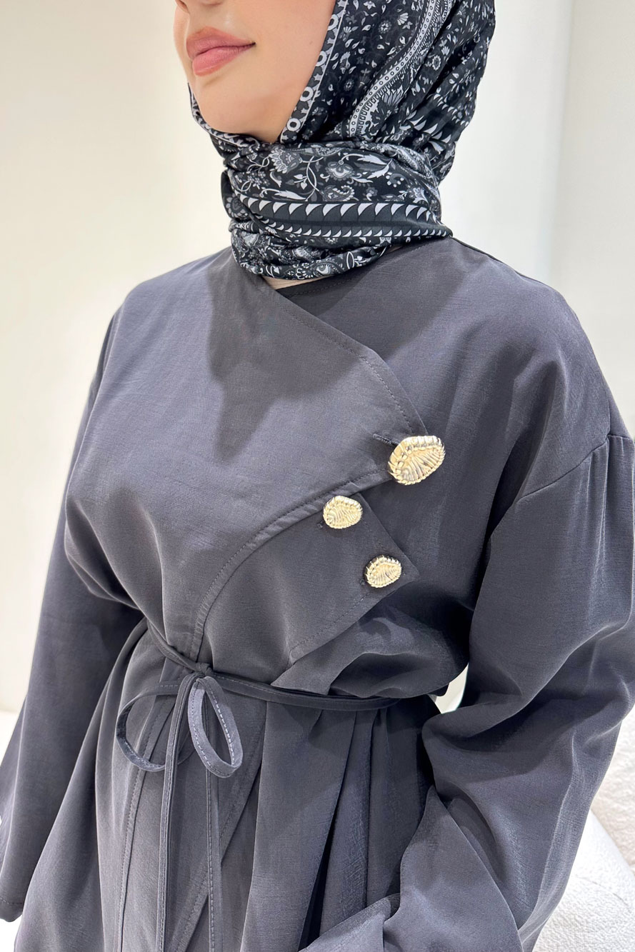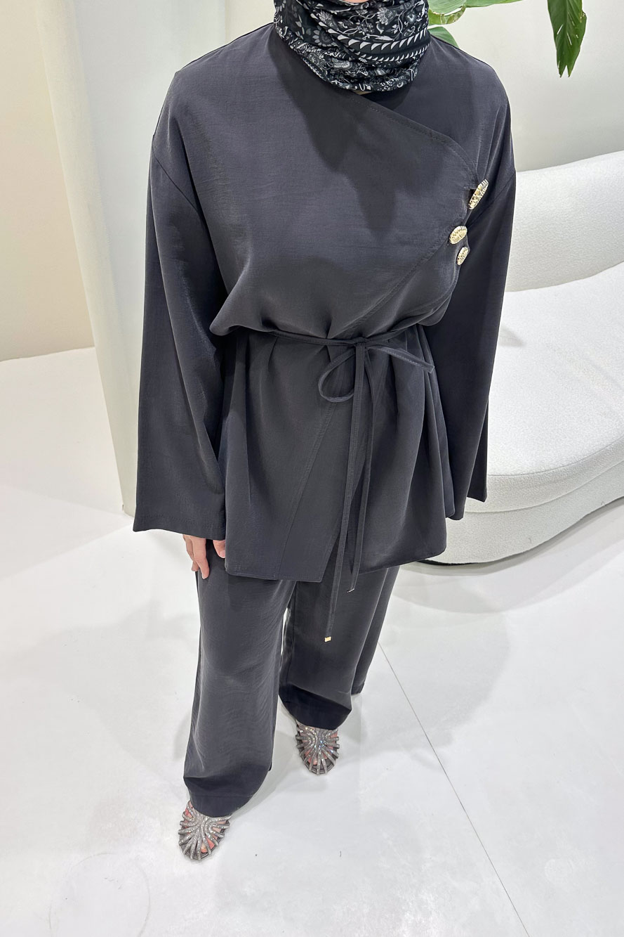 Kruvaze üst tasarımı ve gold düğme detaylarıyla güçlü ve sofistike bir stil sunar.