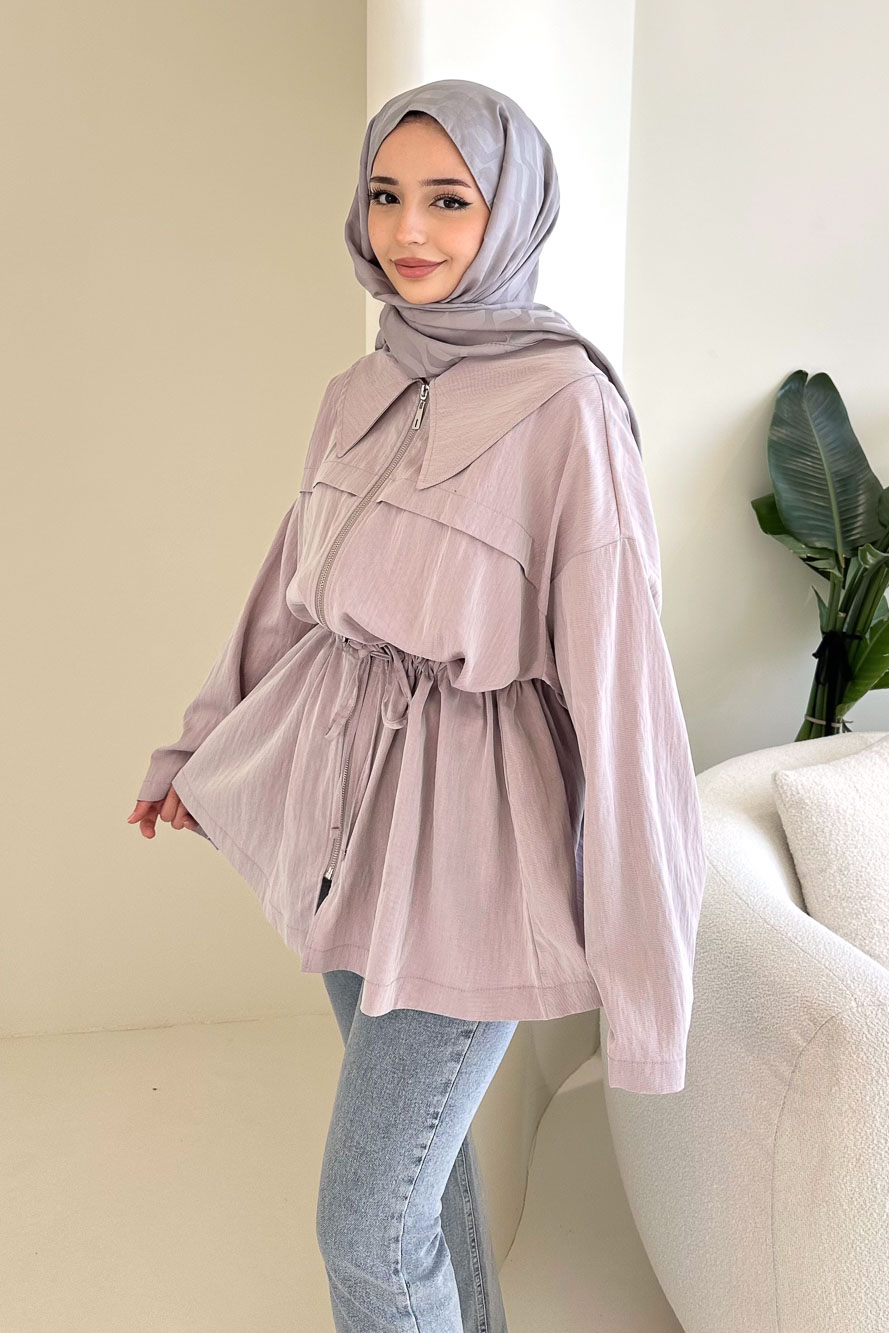 Mendil yaka detayı ile farklı ve şık bir görünüm sağlar. Önü fermuarlıdır. Bel kısmındaki tünel ve stoper detayı sayesinde isteğe göre ayarlanabilir form sunar. Oversize kalıbı ile rahat ve salaş bir duruş sağlar. Manken üzerinde standart bedendir.