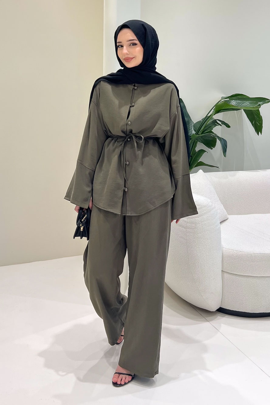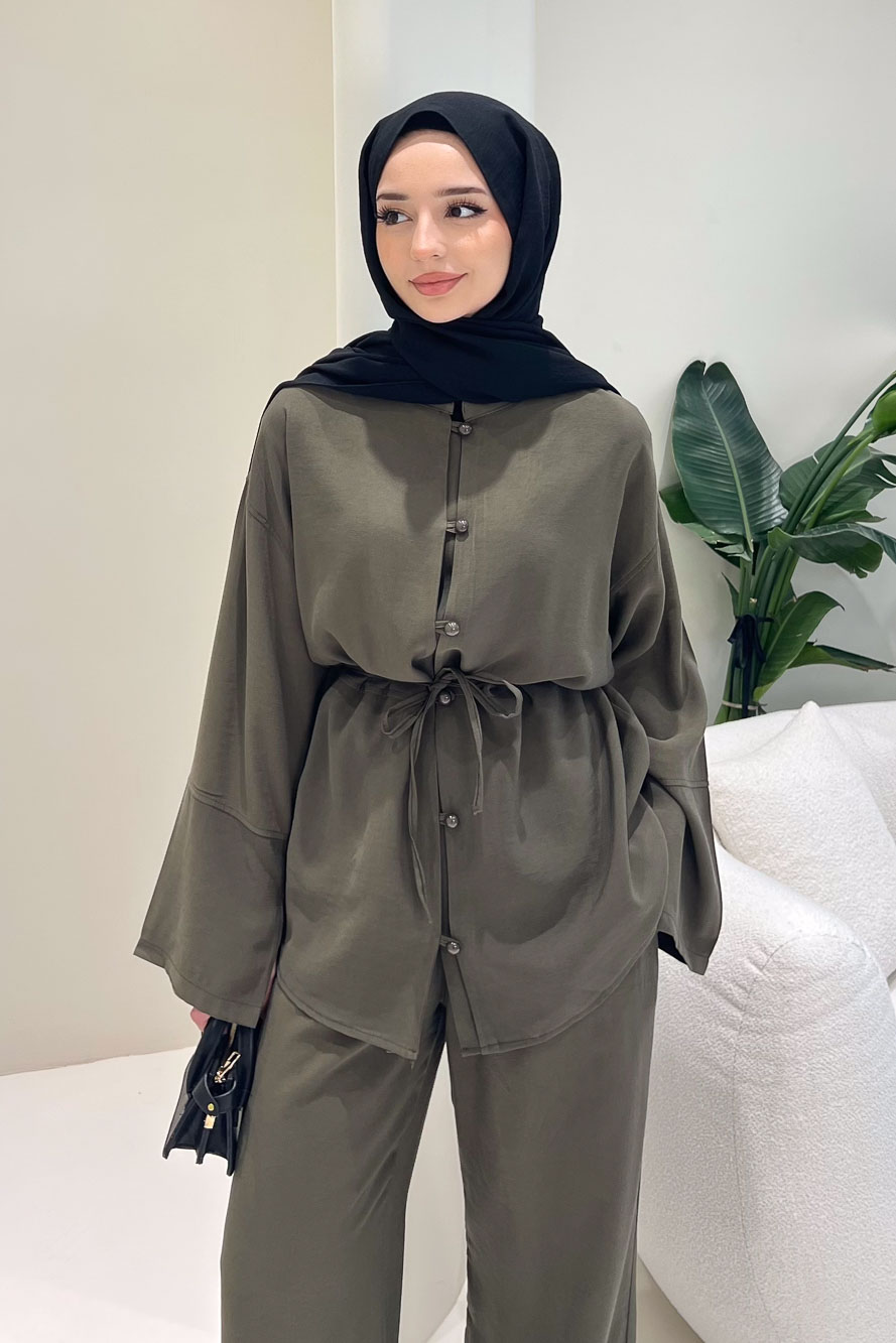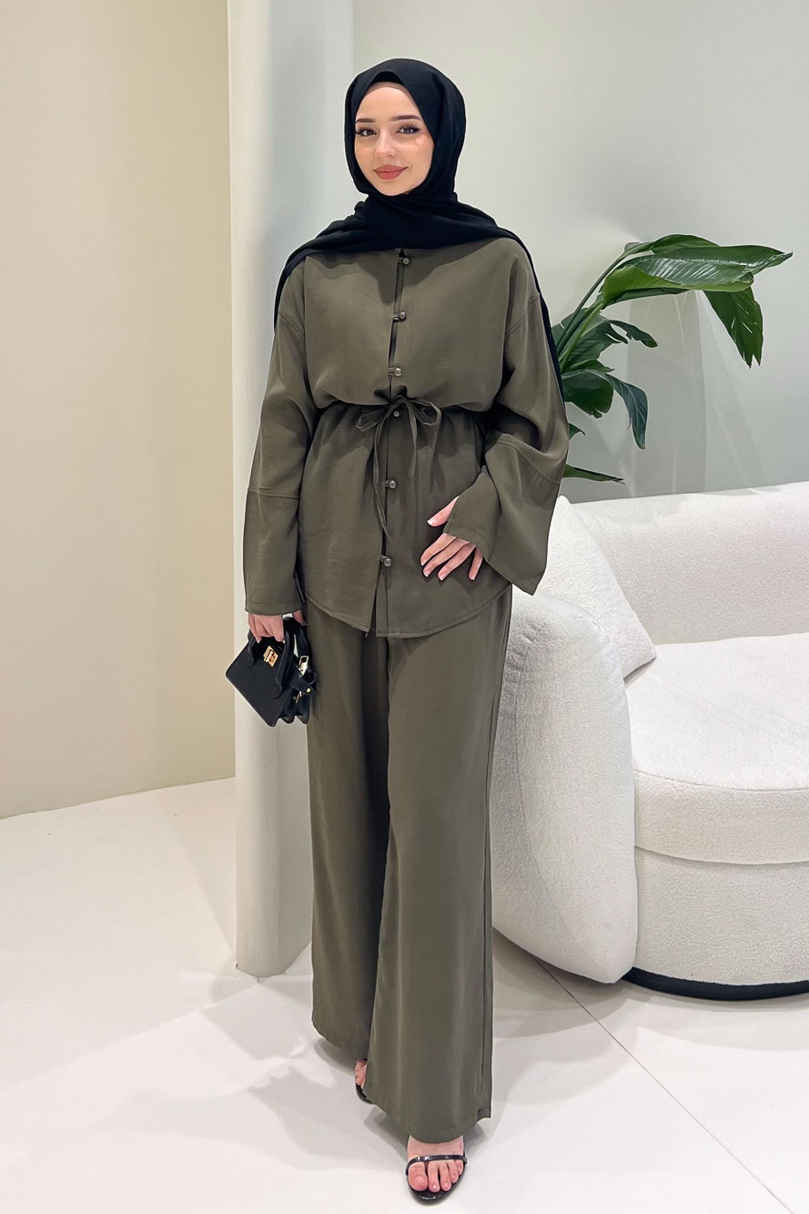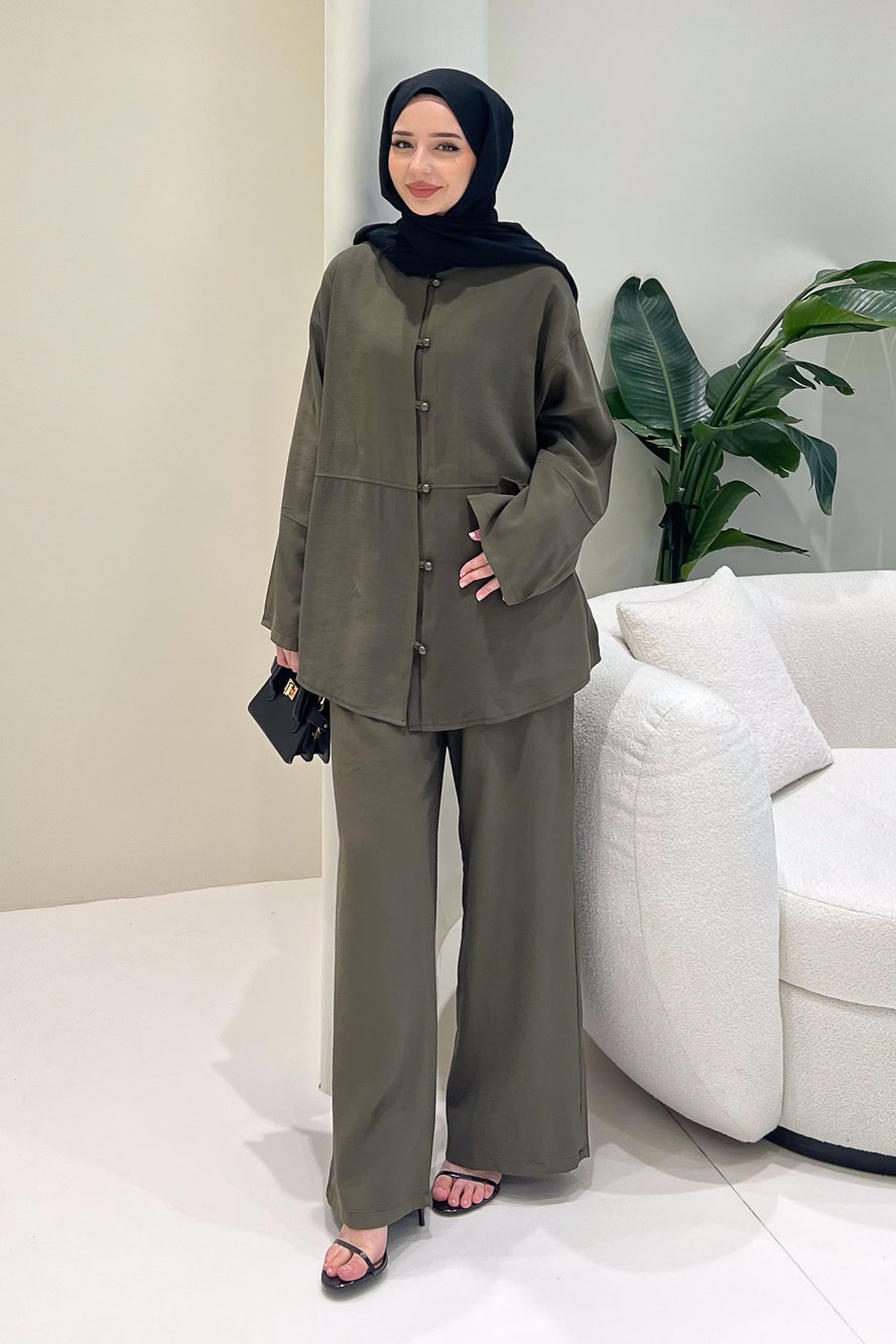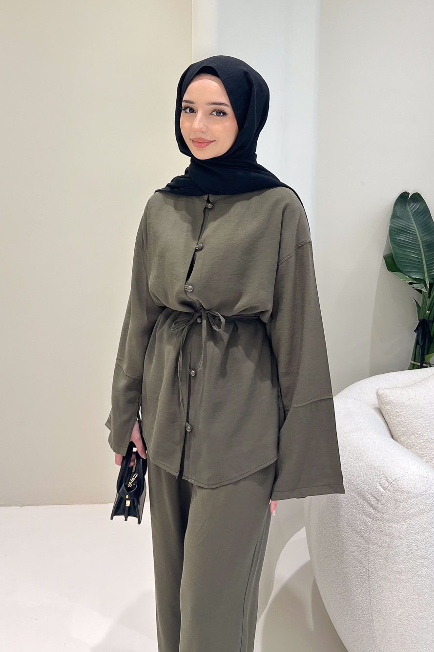 Üst kısmı önden düğmelidir ve kolu yırtmaç detaylıdır. Pantolonu beli lastiklidir, ceplidir ve kemerlidir. Manken üzerinde 1 bedendir.