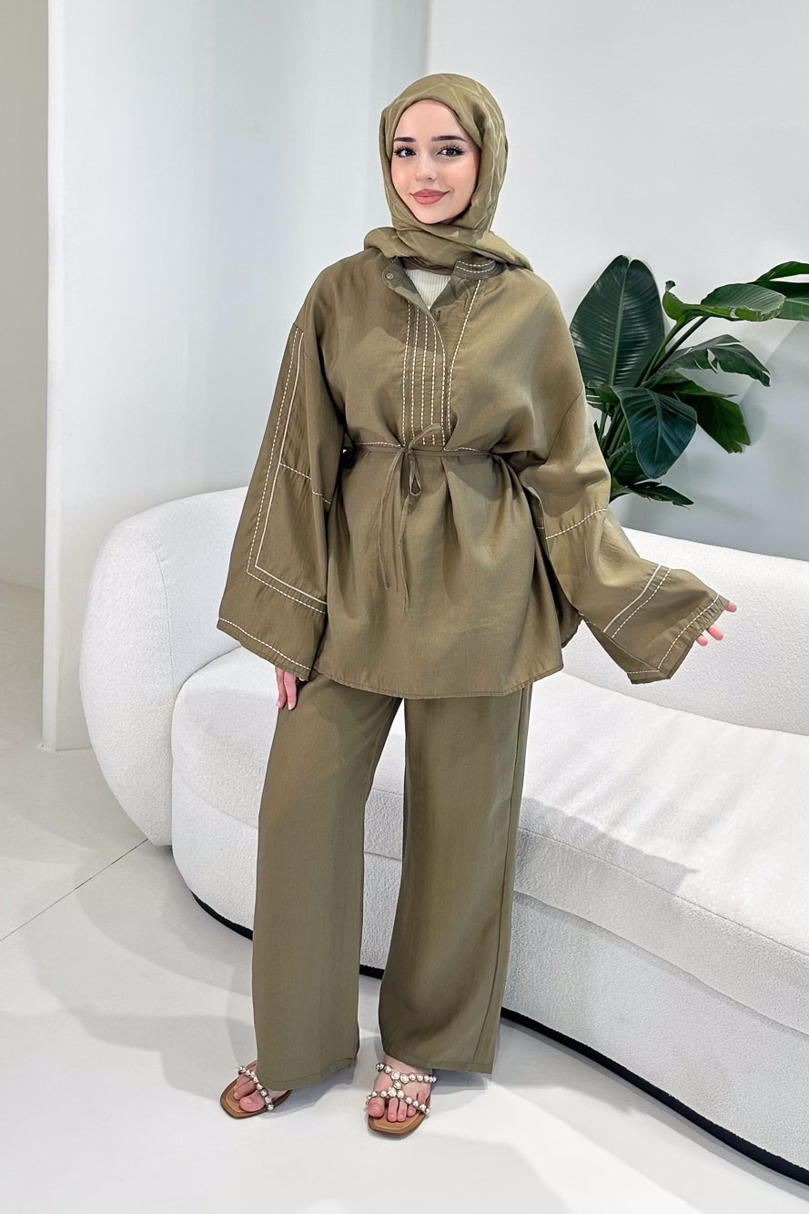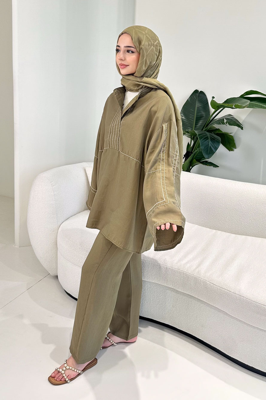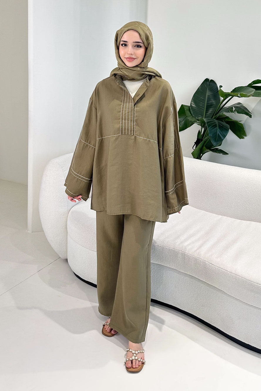 Nakış Detaylı Tesla Takım - Haki