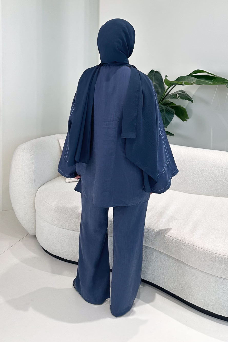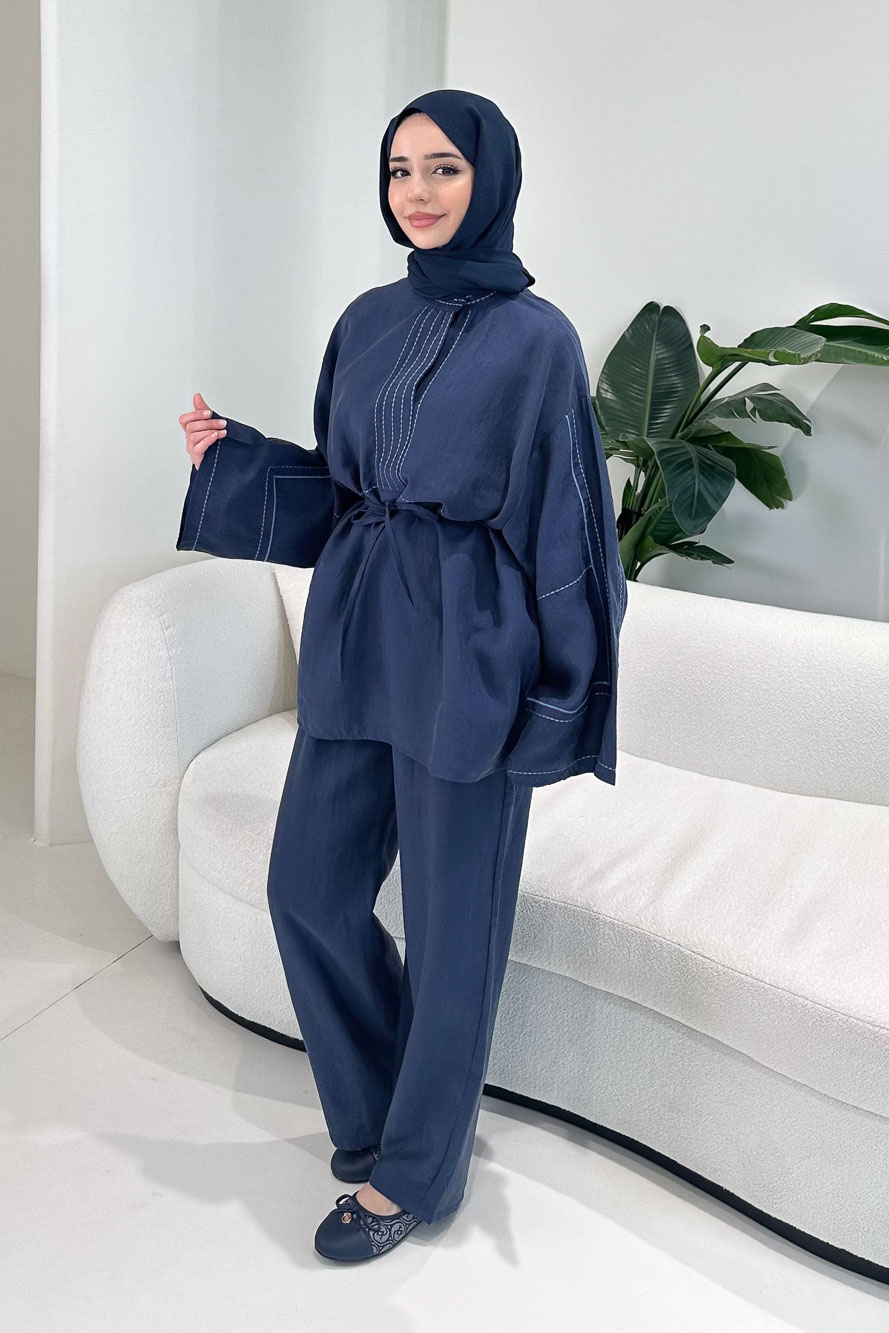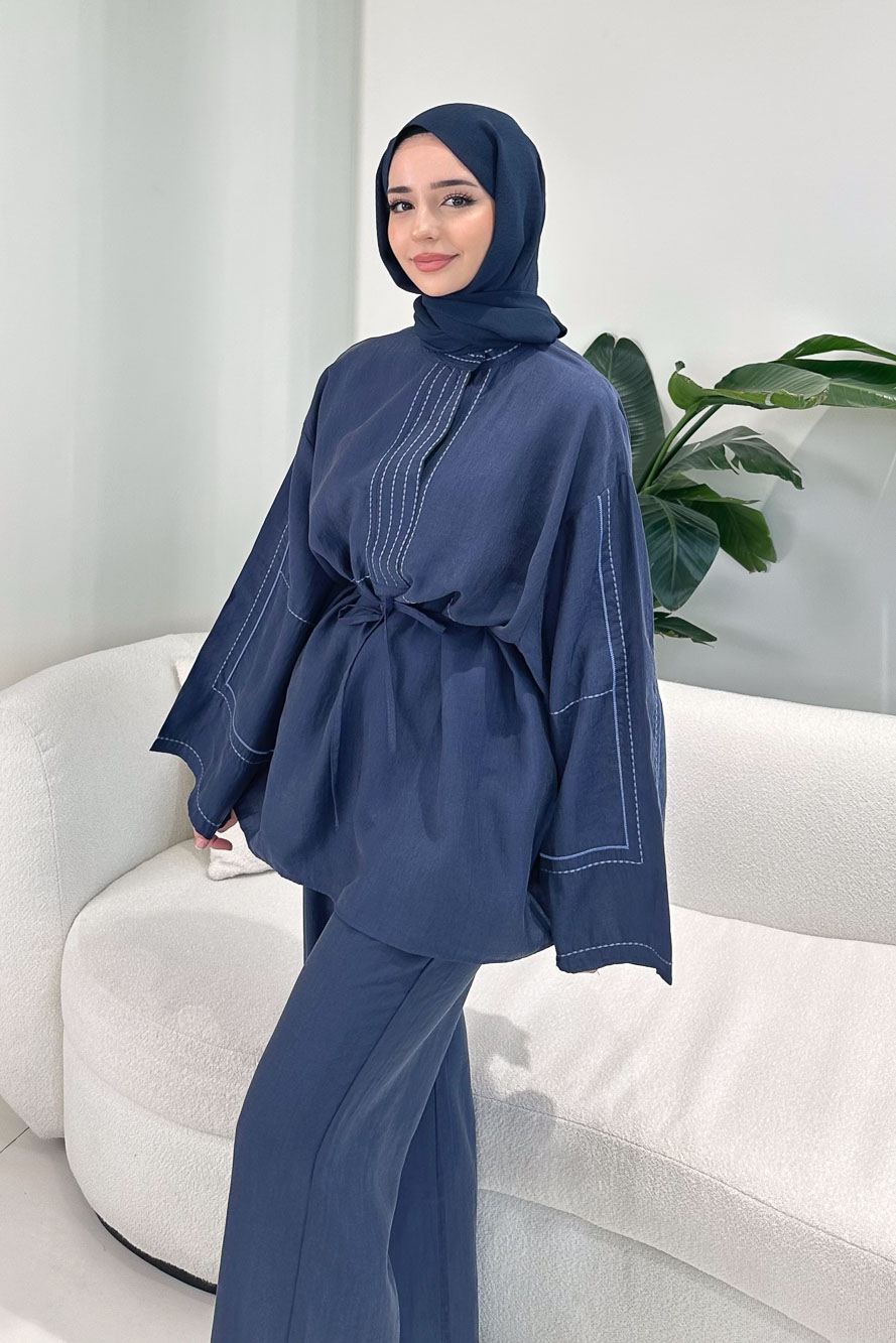 Lynara Yakalı Bluz Pantolon Etek Takım - Lacivert