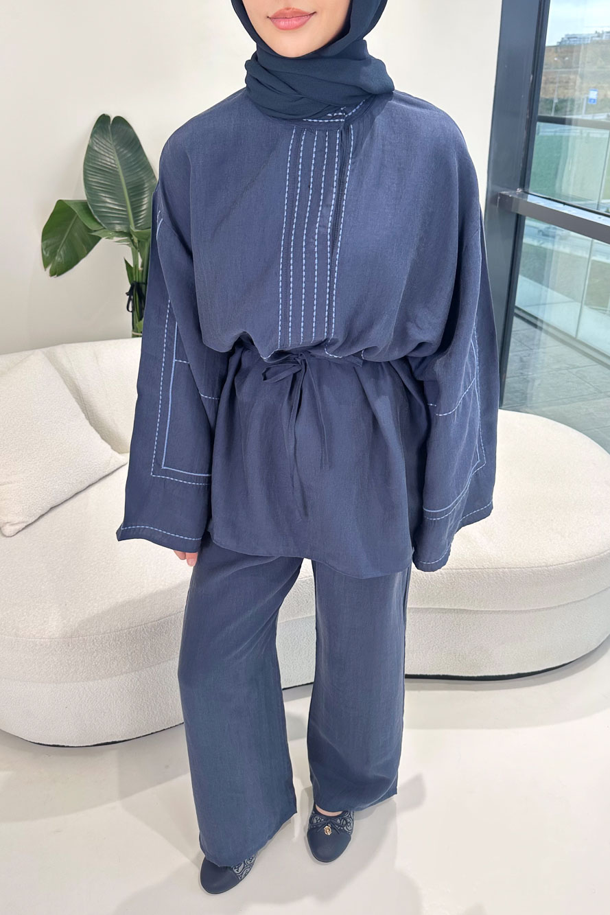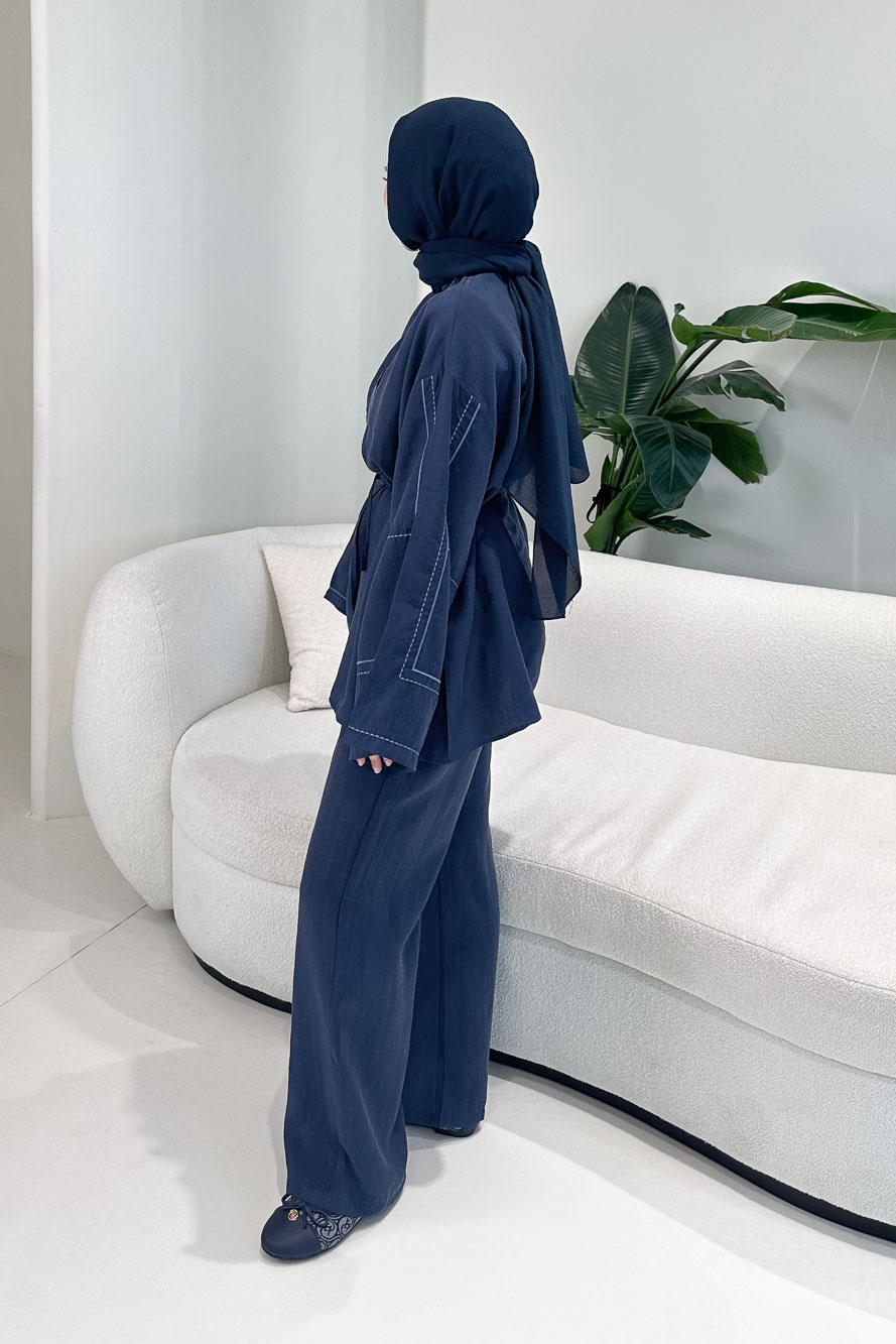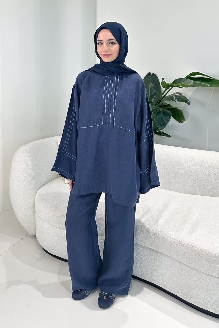 Lynara Yakalı Bluz Pantolon Etek Takım - Lacivert