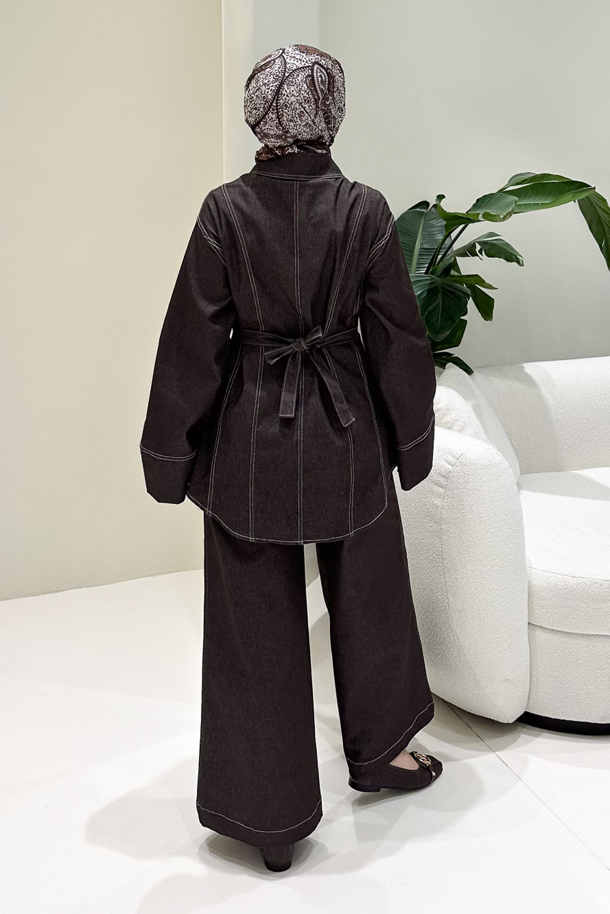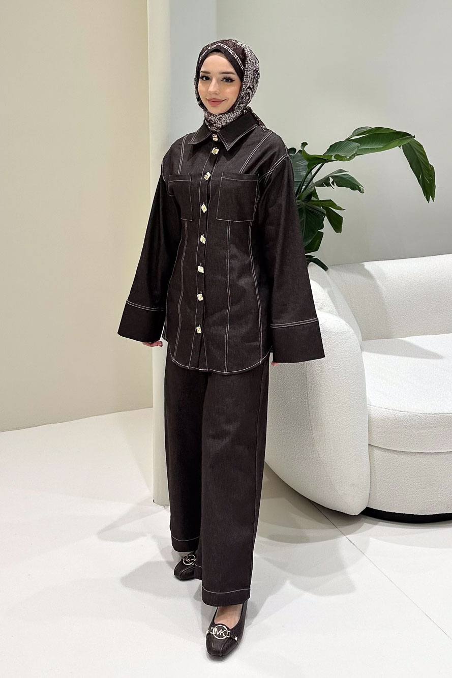 Nova Kot Pantolon Tunik Cepli Düğmeli Takım - Kahverengi