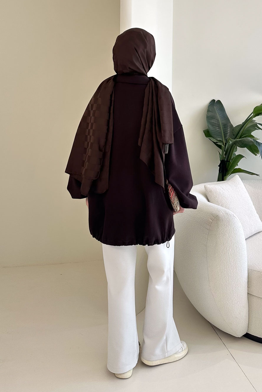 Yüksek yakalı tasarımı sayesinde şık bir görünüm sağlar. Önü fermuarlıdır. Etek kısmındaki stoper detayı ile isteğe göre ayarlanabilir. Kol uçları lastikli yapısıyla rahat bir kullanım sunar. Oversize kalıbı sayesinde modern ve salaş bir duruşa sahiptir. Manken üzerinde standart bedendir.