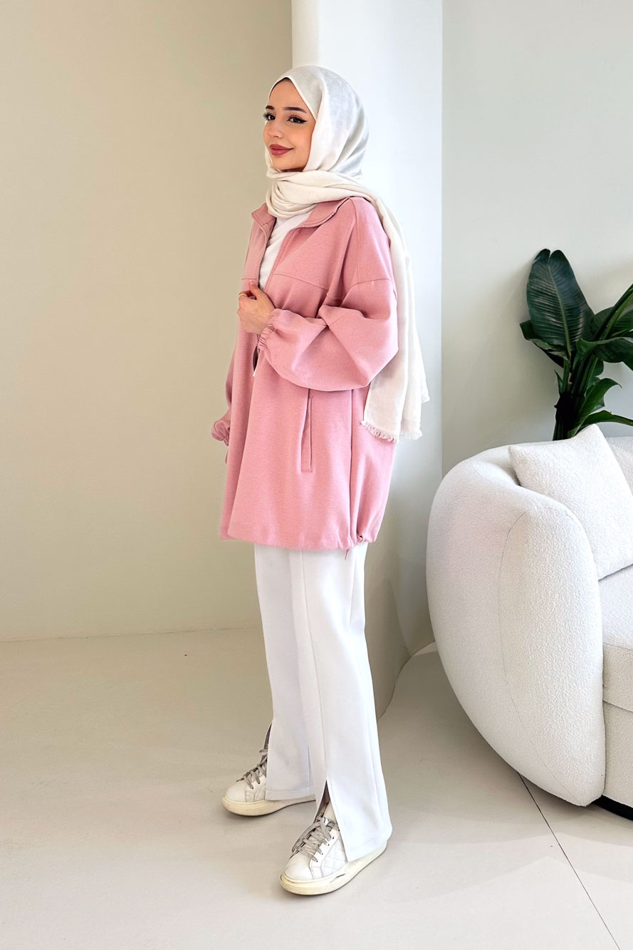 Yüksek yakalı tasarımı sayesinde şık bir görünüm sağlar. Önü fermuarlıdır. Etek kısmındaki stoper detayı ile isteğe göre ayarlanabilir. Kol uçları lastikli yapısıyla rahat bir kullanım sunar. Oversize kalıbı sayesinde modern ve salaş bir duruşa sahiptir. Manken üzerinde standart bedendir.