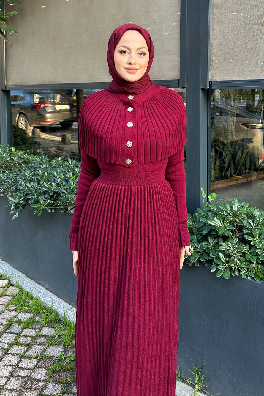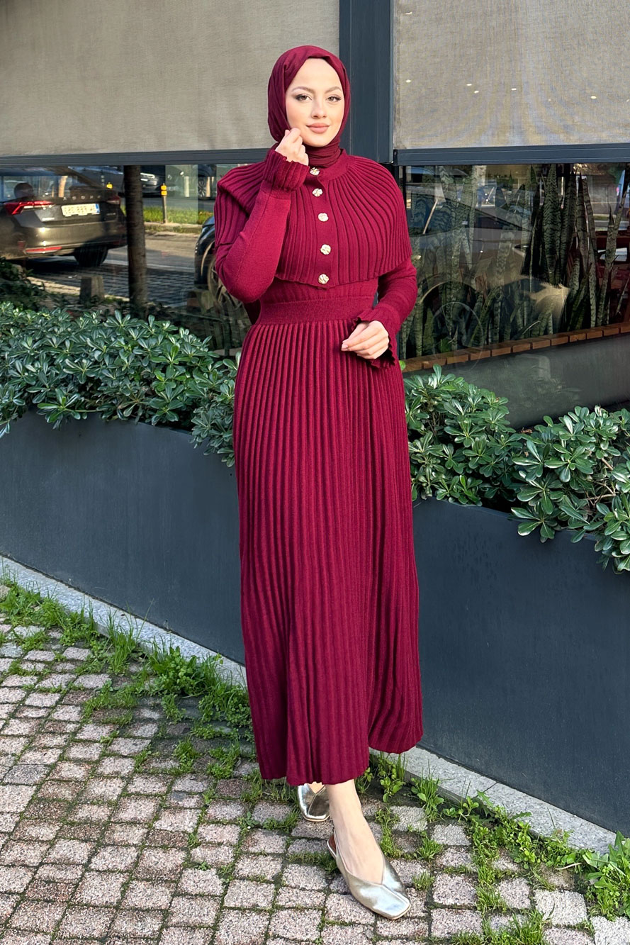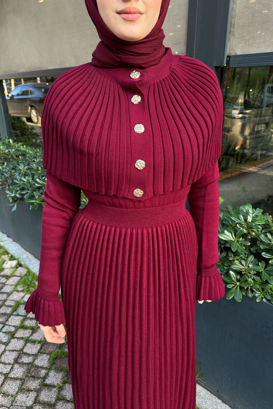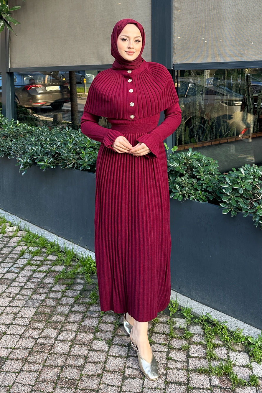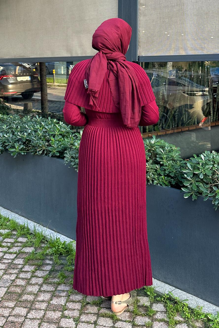 Pelerinli İki Parça Triko Elbise - Bordo
