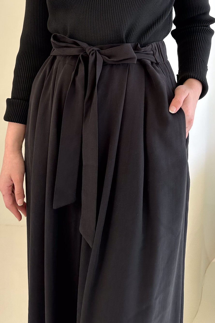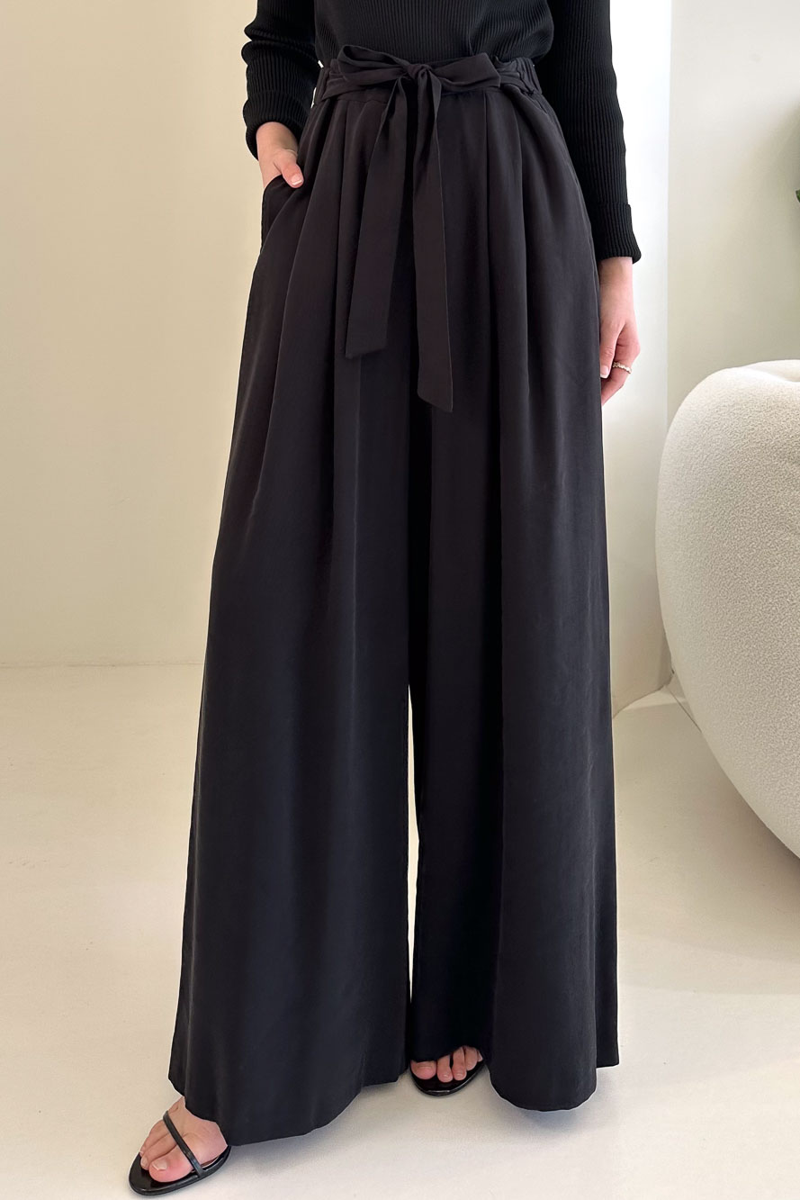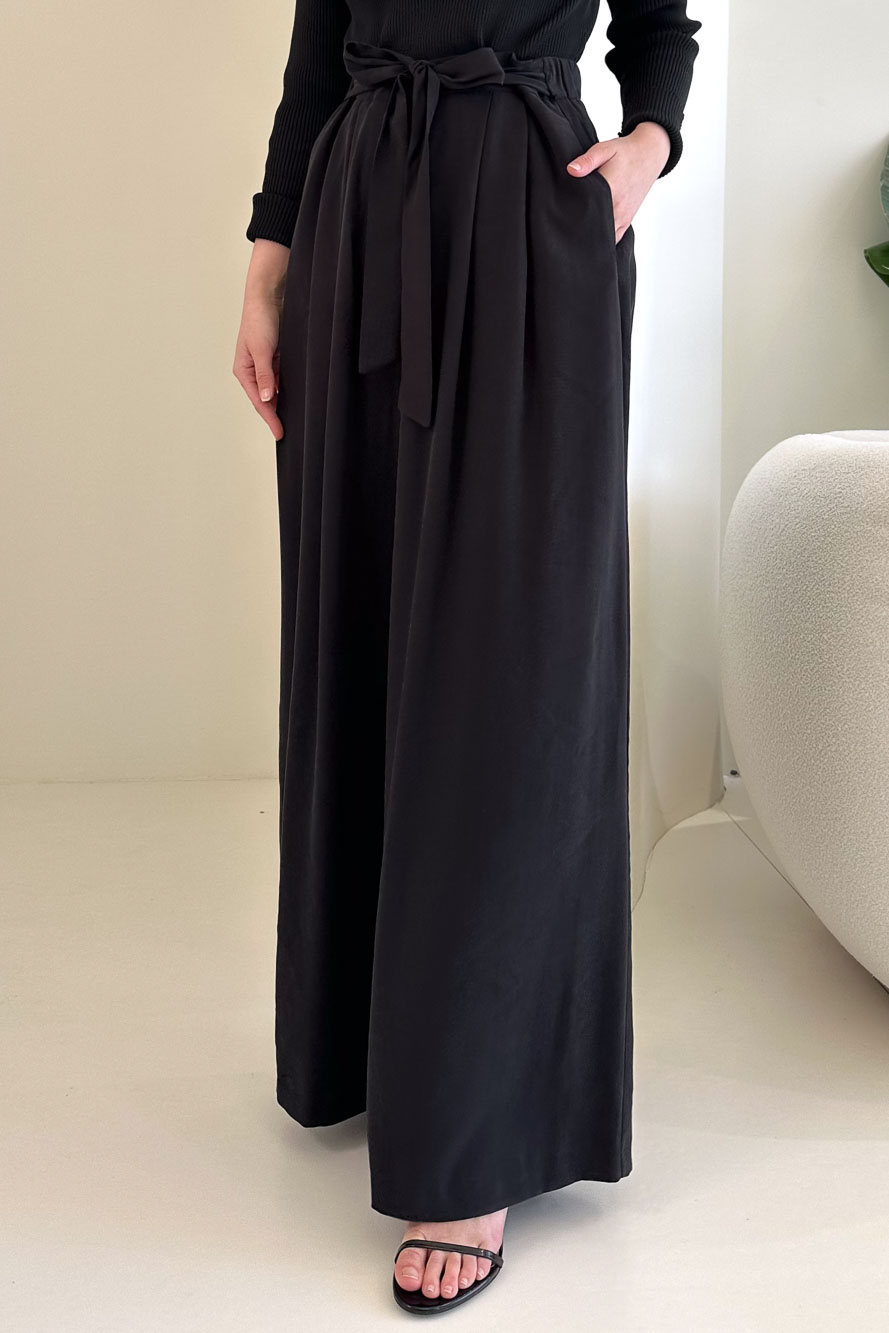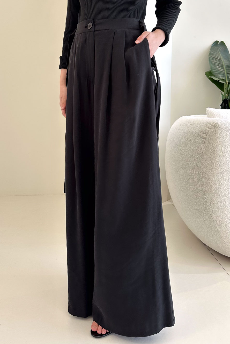Pile Detaylı Geniş Paça Pantolon - Siyah