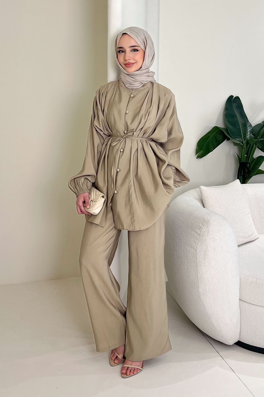 Üst kısmındaki pile detayları takıma hareketli ve sofistike bir görünüm kazandırır. Önü top düğmeli tasarımı klasik bir şıklık sunarken, kol lastikleri rahat kullanım sağlar. Pantolonun beli tam lastiklidir ve gün boyu konfor sunar. Cepli yapısı ve seyyar kemeri ile hem şık hem fonksiyonel bir kullanım sağlar. Manken üzerinde 1 bedendir.