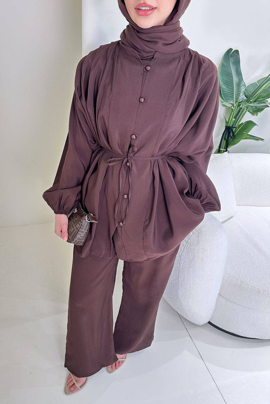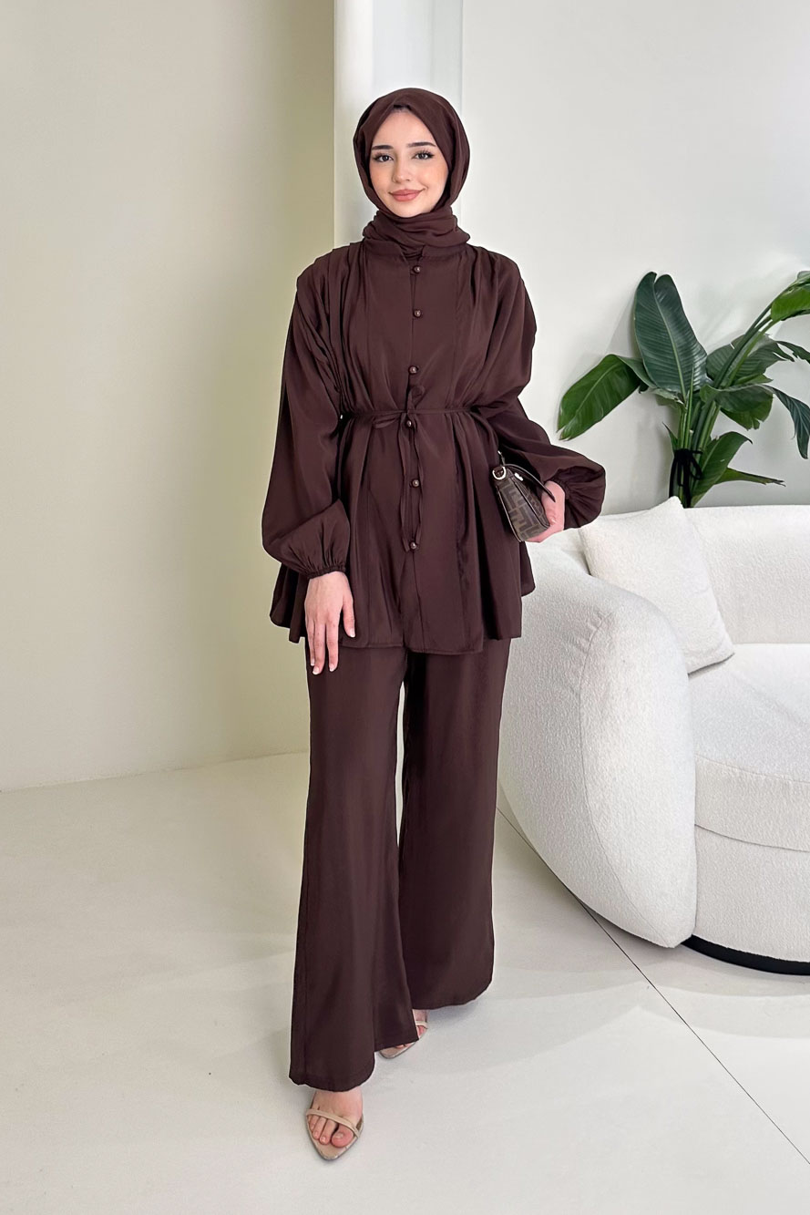 Üst kısmındaki pile detayları takıma hareketli ve sofistike bir görünüm kazandırır. Önü top düğmeli tasarımı klasik bir şıklık sunarken, kol lastikleri rahat kullanım sağlar. Pantolonun beli tam lastiklidir ve gün boyu konfor sunar. Cepli yapısı ve seyyar kemeri ile hem şık hem fonksiyonel bir kullanım sağlar. Manken üzerinde 1 bedendir.