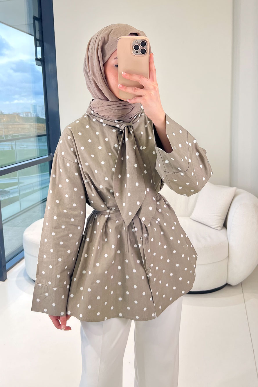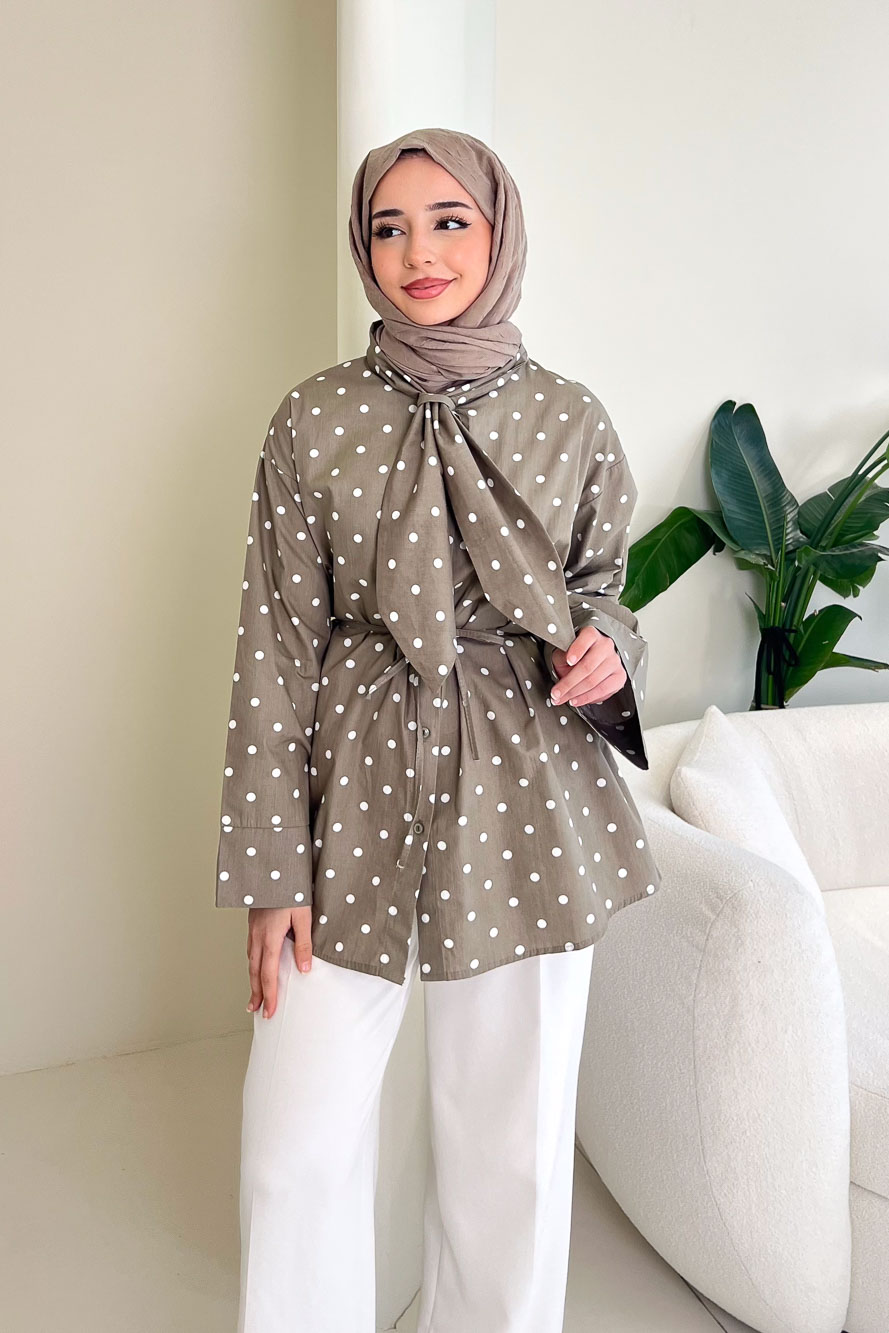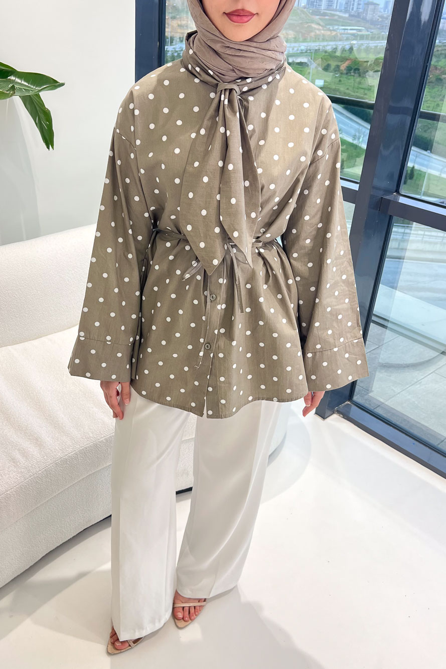 Puantiyeli Bağcık Detaylı Gömlek - Haki