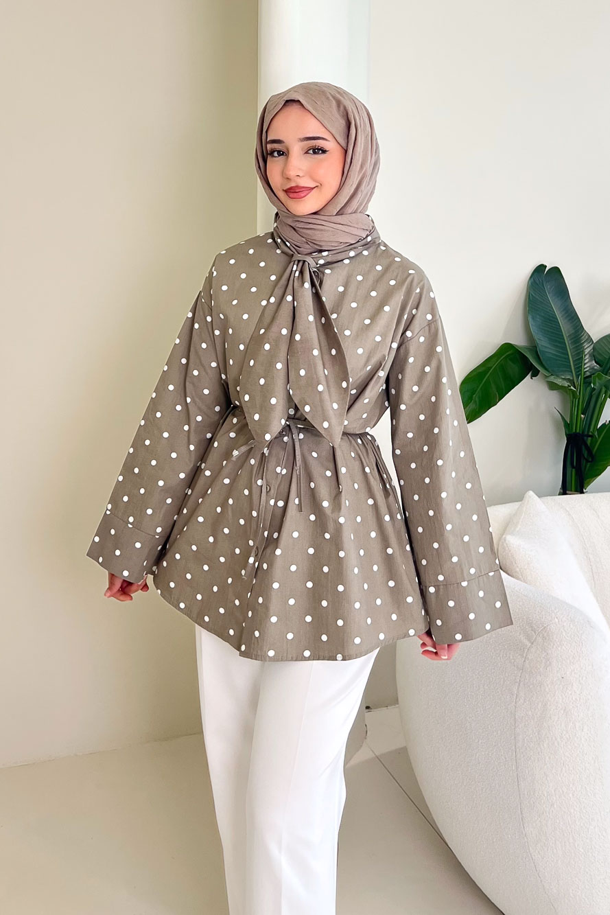 Puantiyeli Bağcık Detaylı Gömlek - Kahverengi