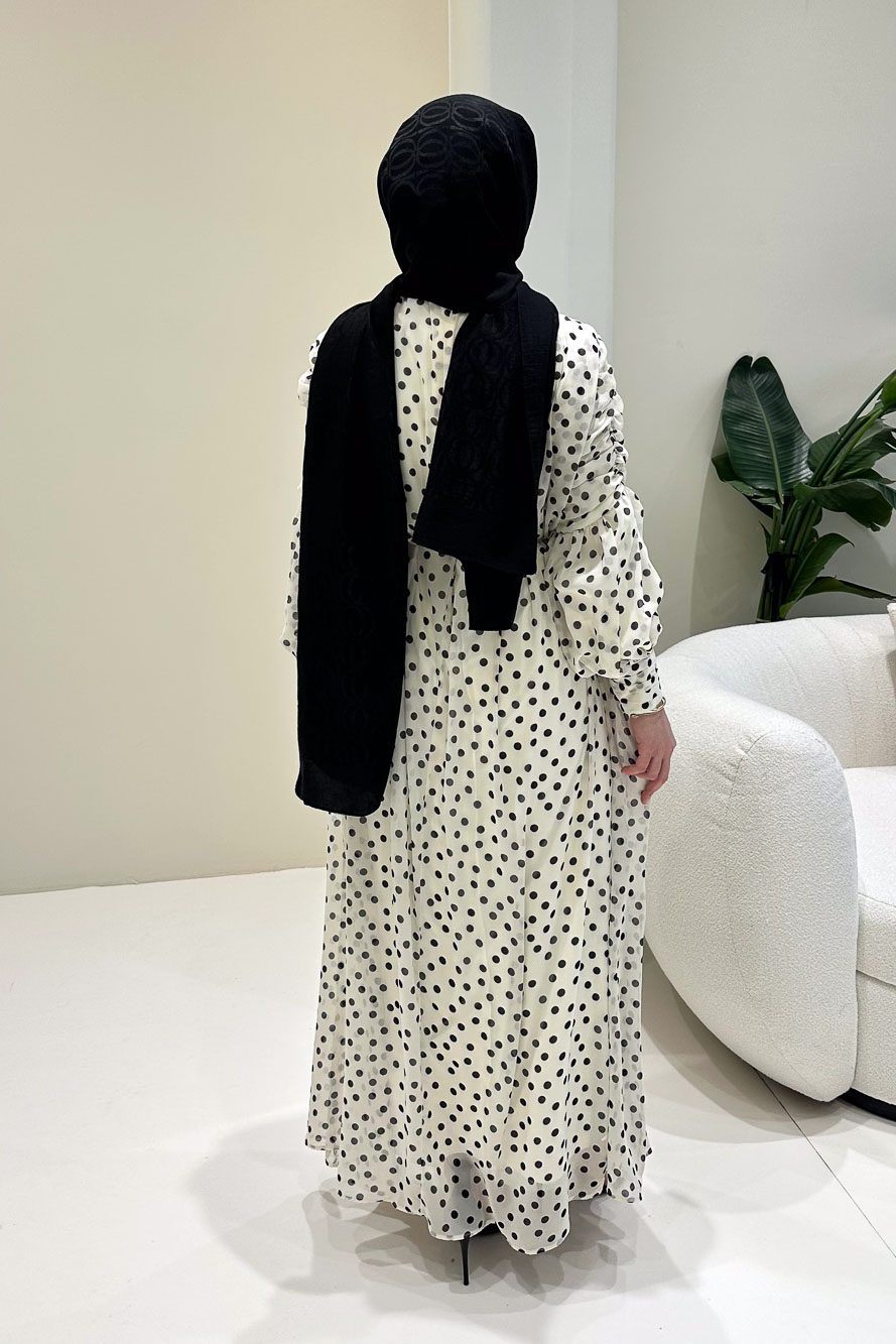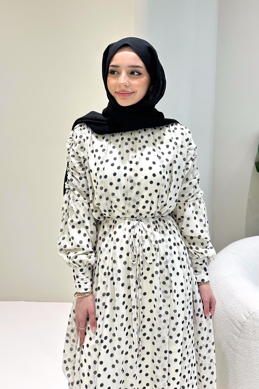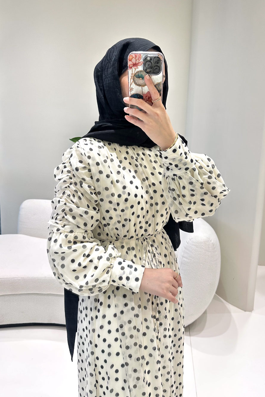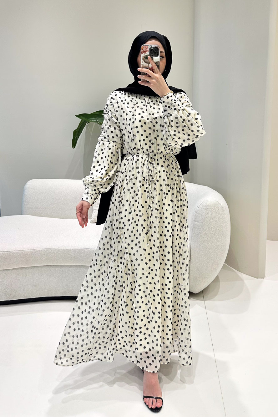 Şifon dokusu ve puantiye deseniyle hafif, zarif ve feminen bir stil sunar.