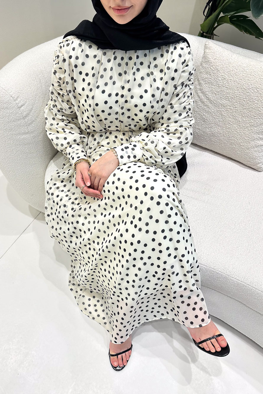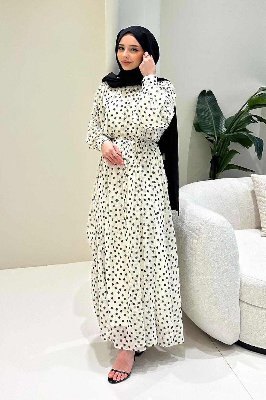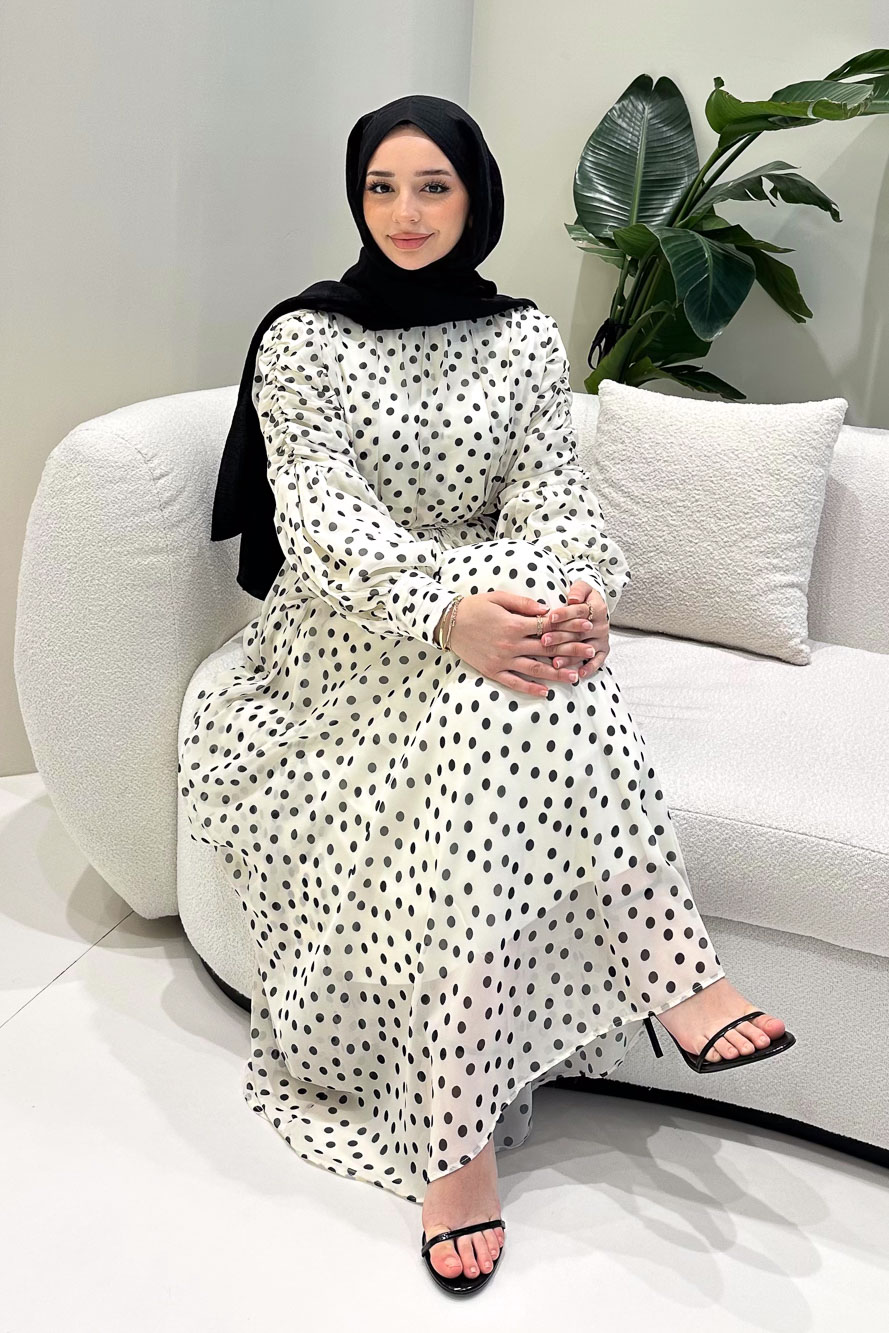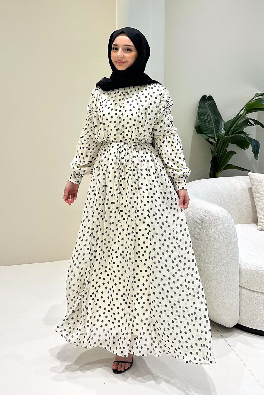 Şifon dokusu ve puantiye deseniyle hafif, zarif ve feminen bir stil sunar.