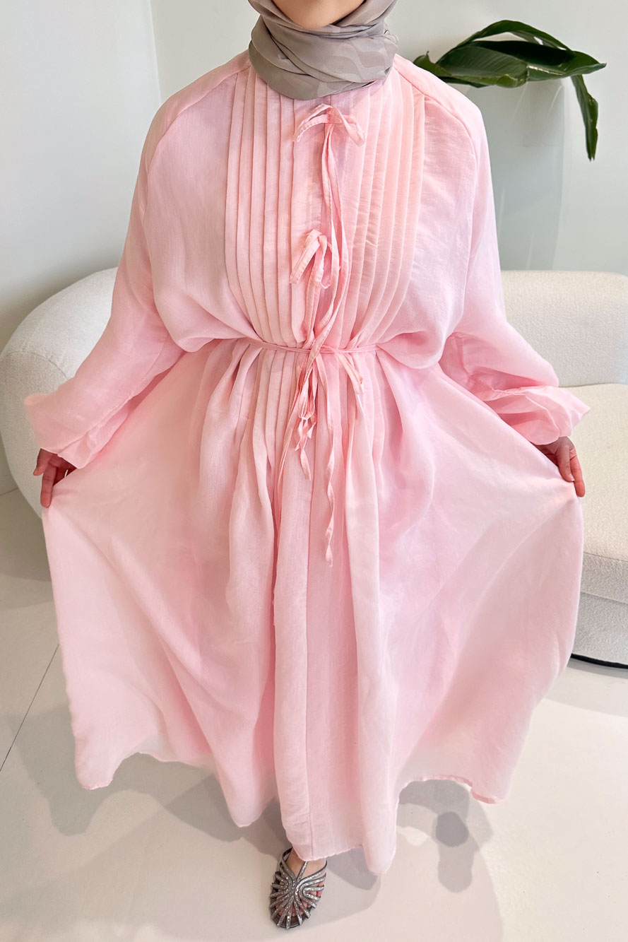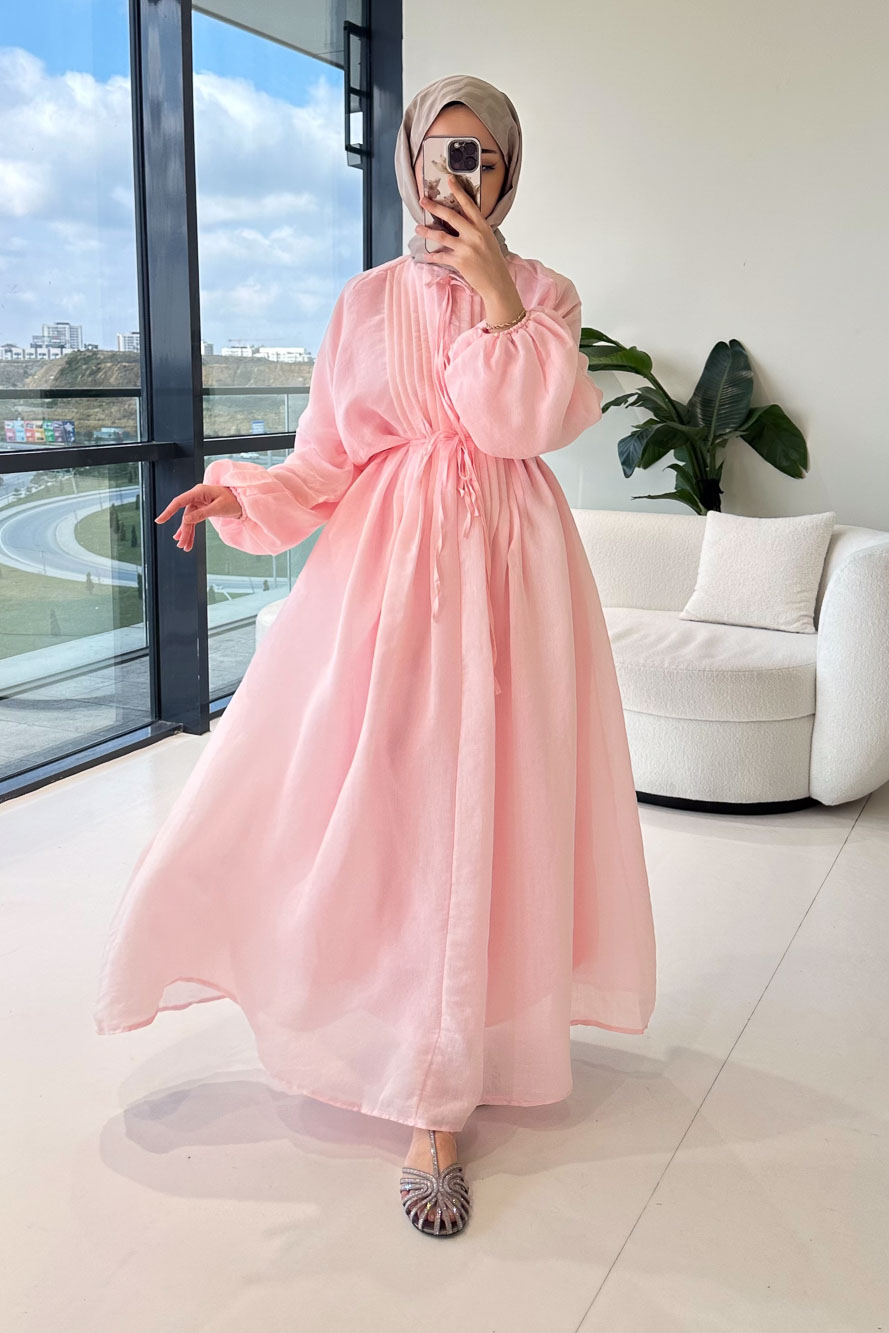 Ön kısmı tam boy düğmelidir ve nervür detayları ile şık bir görünüm kazanır. Fiyonk bağlama detayı elbiseye zarif bir hava katarken, seyyar kemeri ile bel vurgusu yapılabilir. Kolları lastiklidir ve astarlı yapısı sayesinde rahat bir kullanım sağlar. Manken üzerinde SM bedendir.