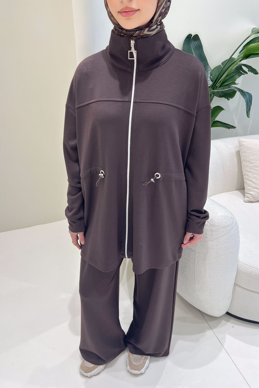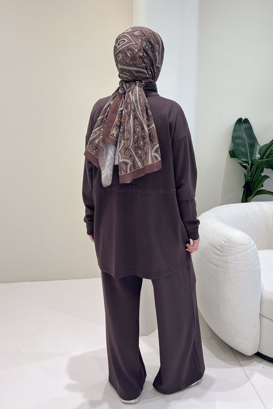 Nova Kot Pantolon Tunik Cepli Düğmeli Takım - Kahverengi