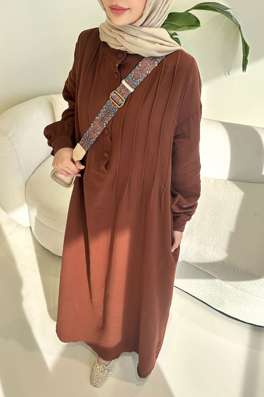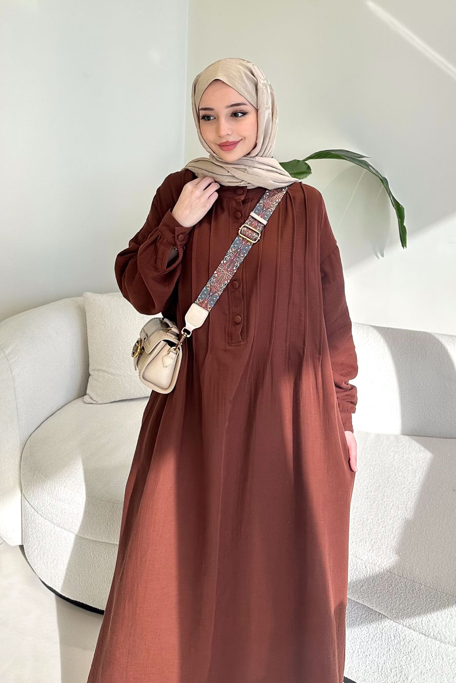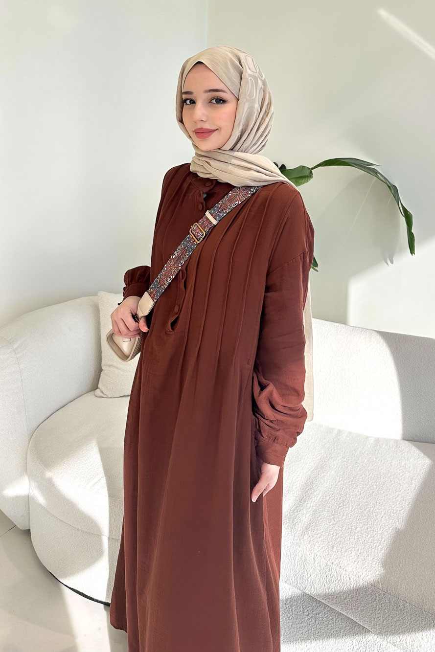 Sahra Yarım Düğmeli Müslin Elbise - Kahverengi