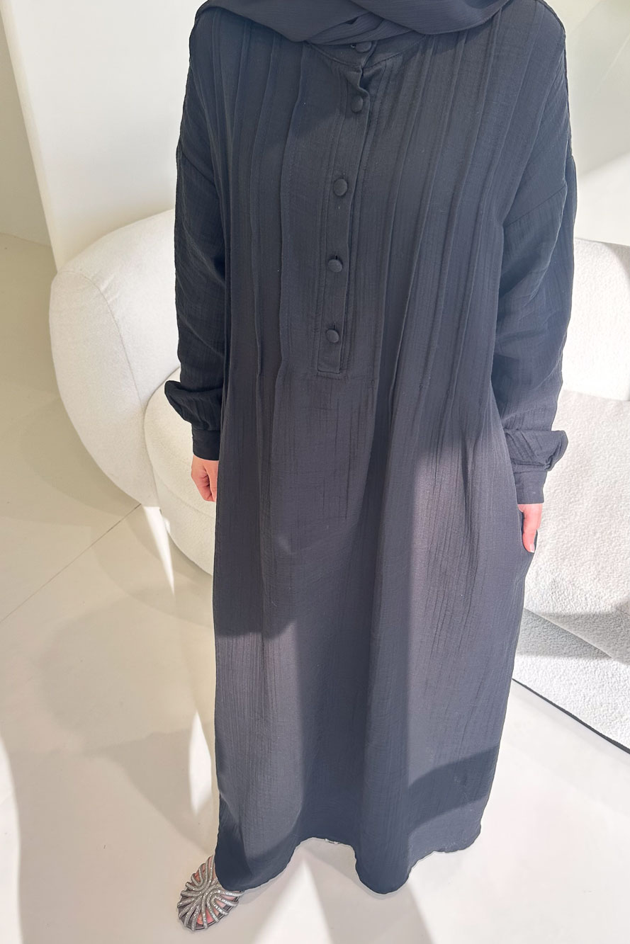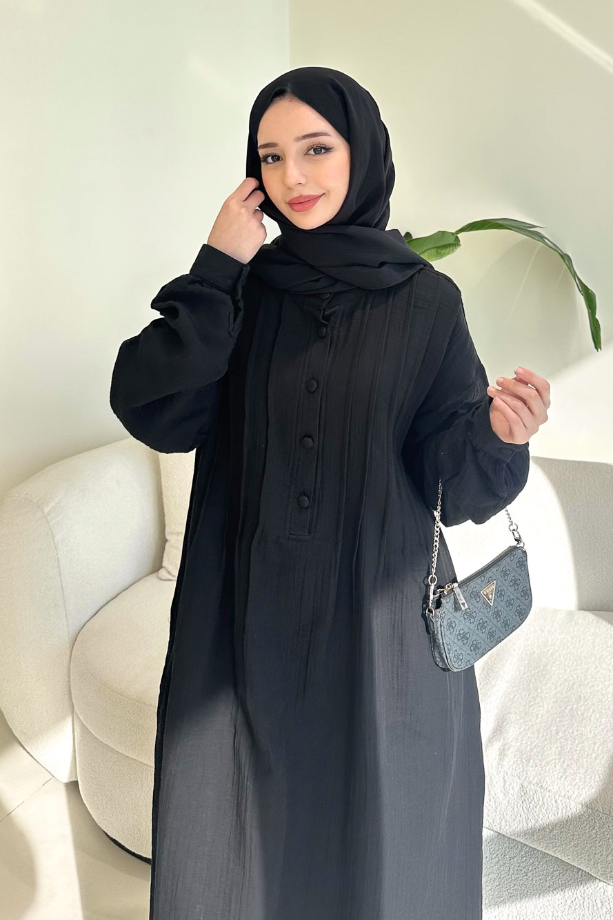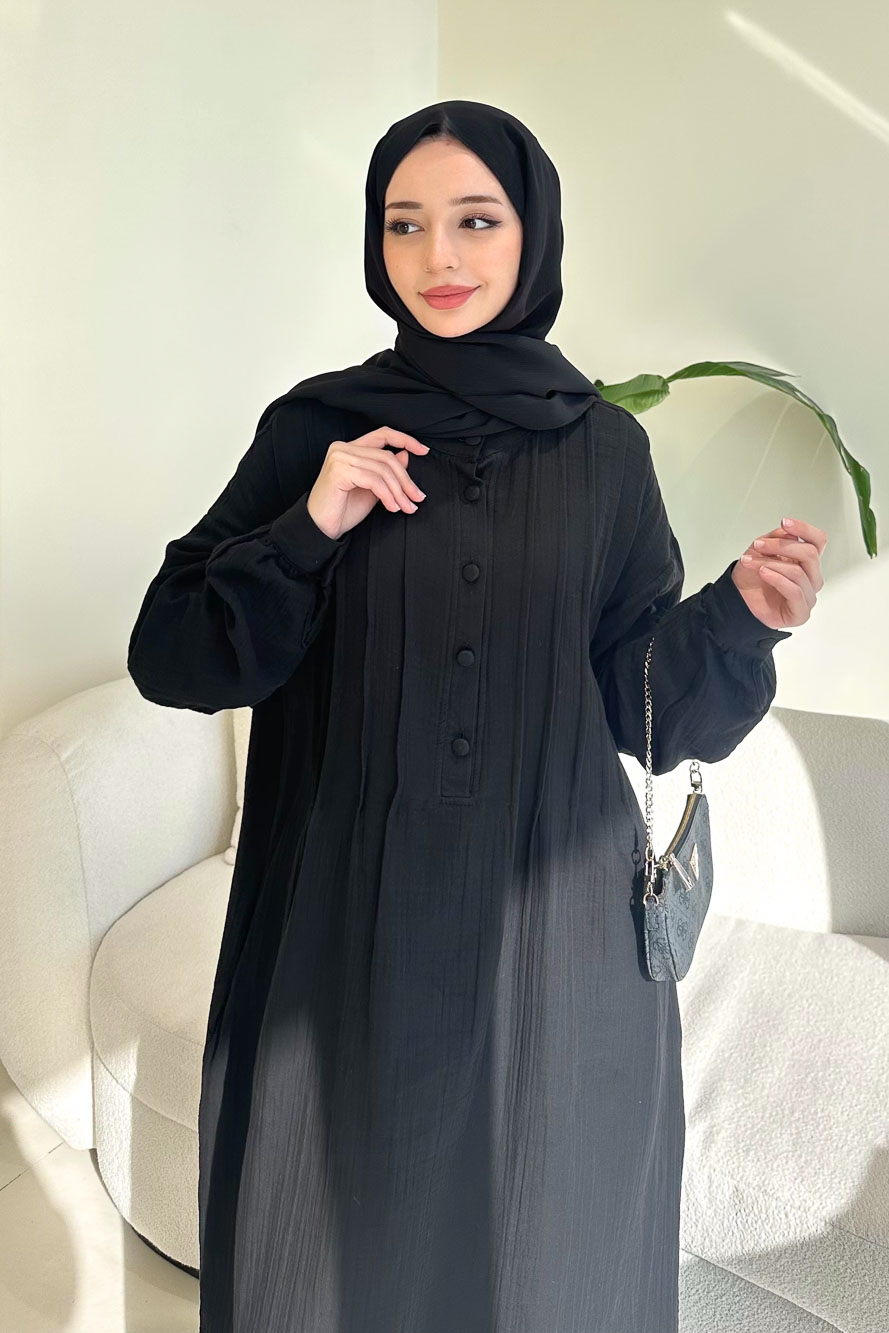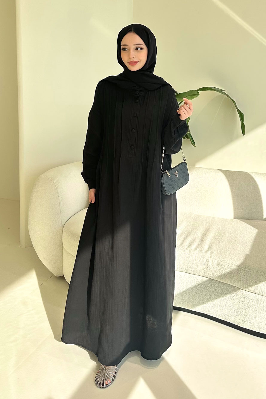 Sahra Yarım Düğmeli Müslin Elbise - Siyah