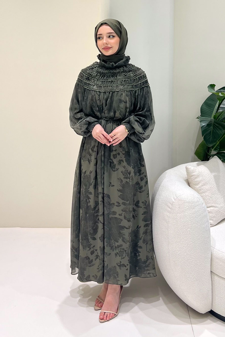 Desenli yüzeyi ve gipeli yapısıyla romantik ve akışkan bir siluet sunar.