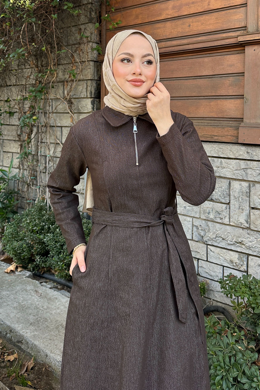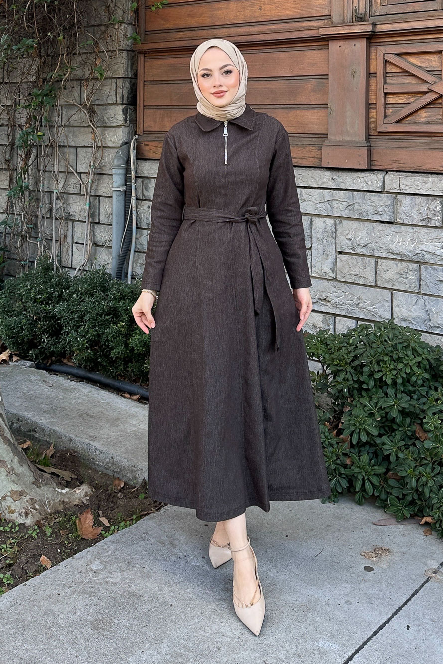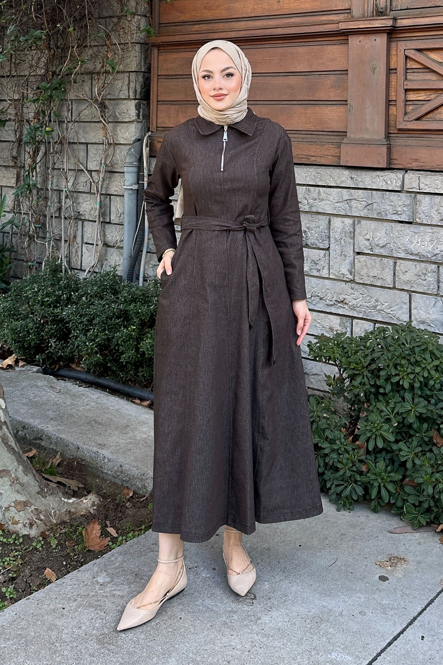 Nilla Yakalı Kemerli Elbise - Kahverengi