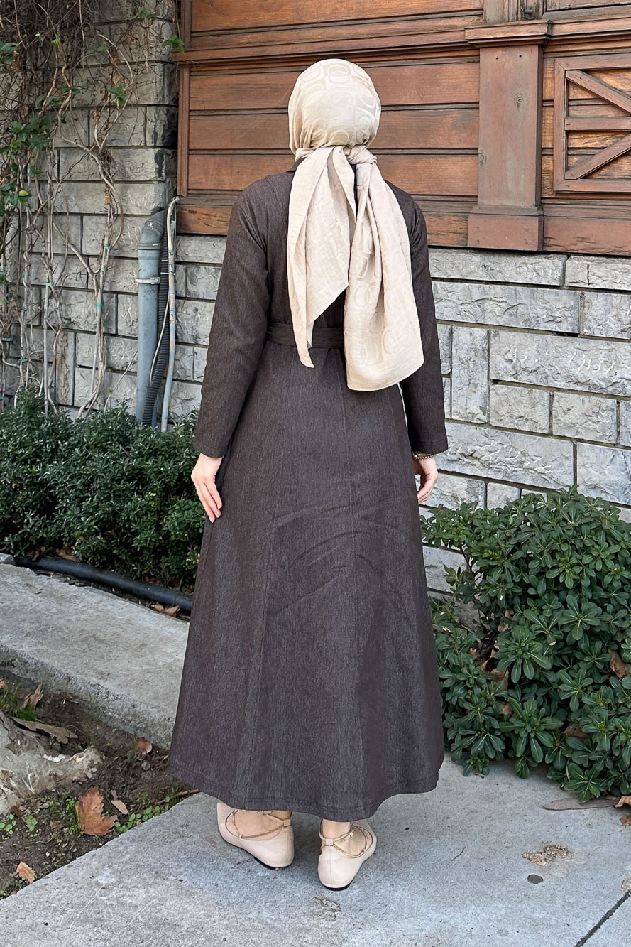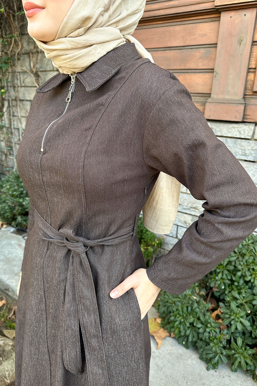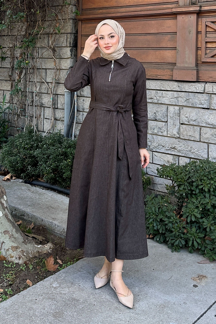 Nilla Yakalı Kemerli Elbise - Kahverengi