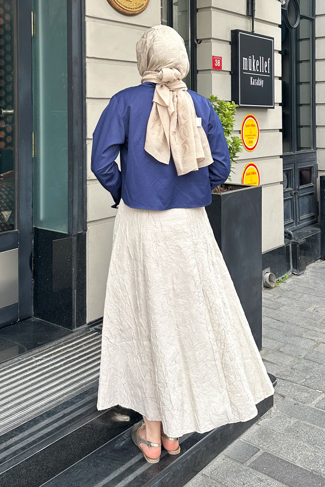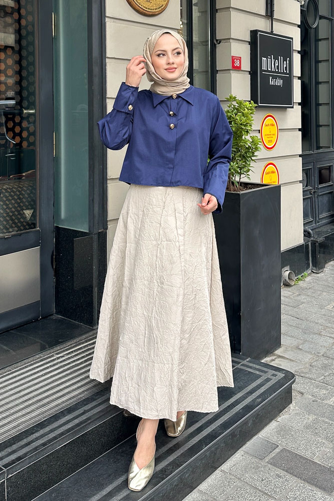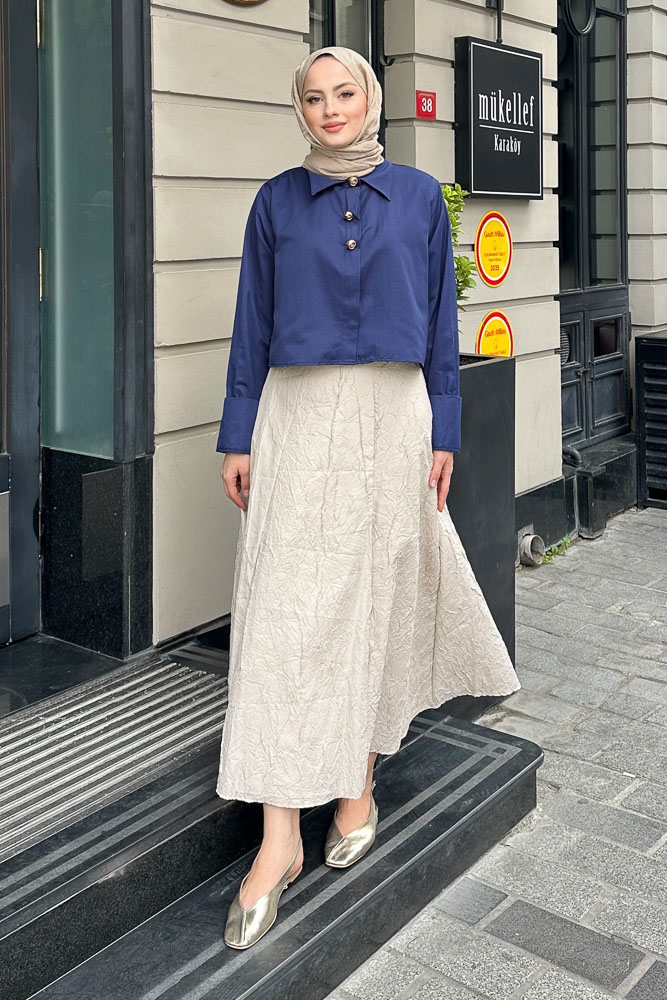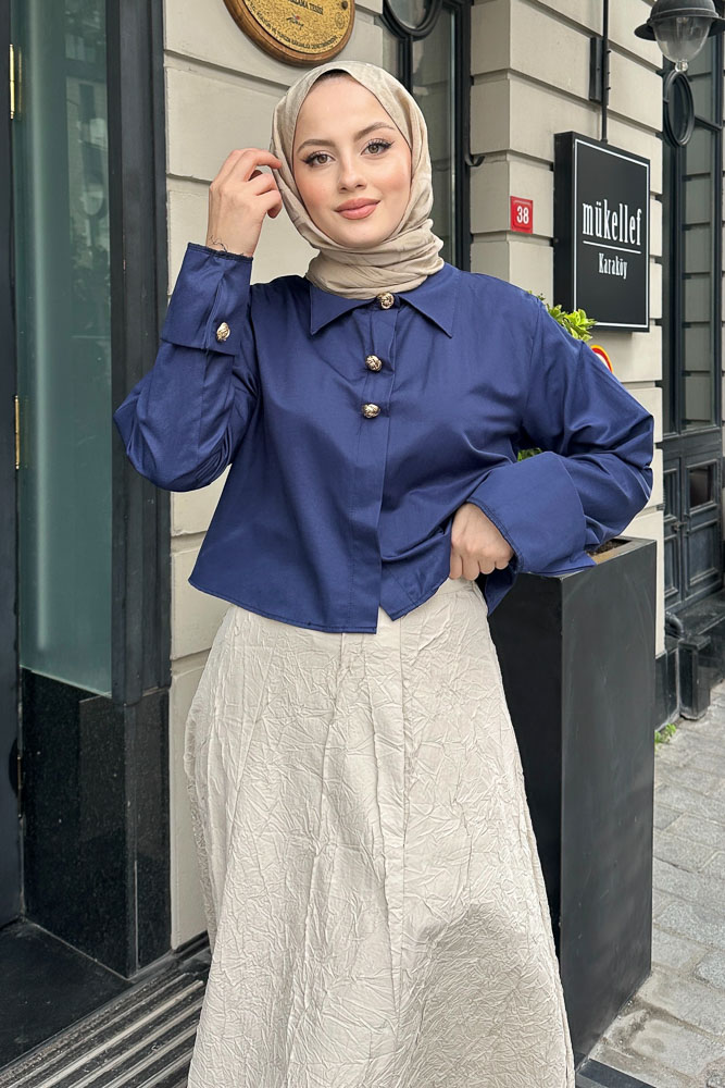 Üç Düğmeli Büzgülü Gömlek - Lacivert