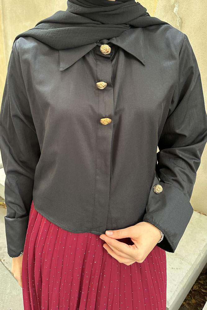 Üç Düğmeli Büzgülü Gömlek - Siyah