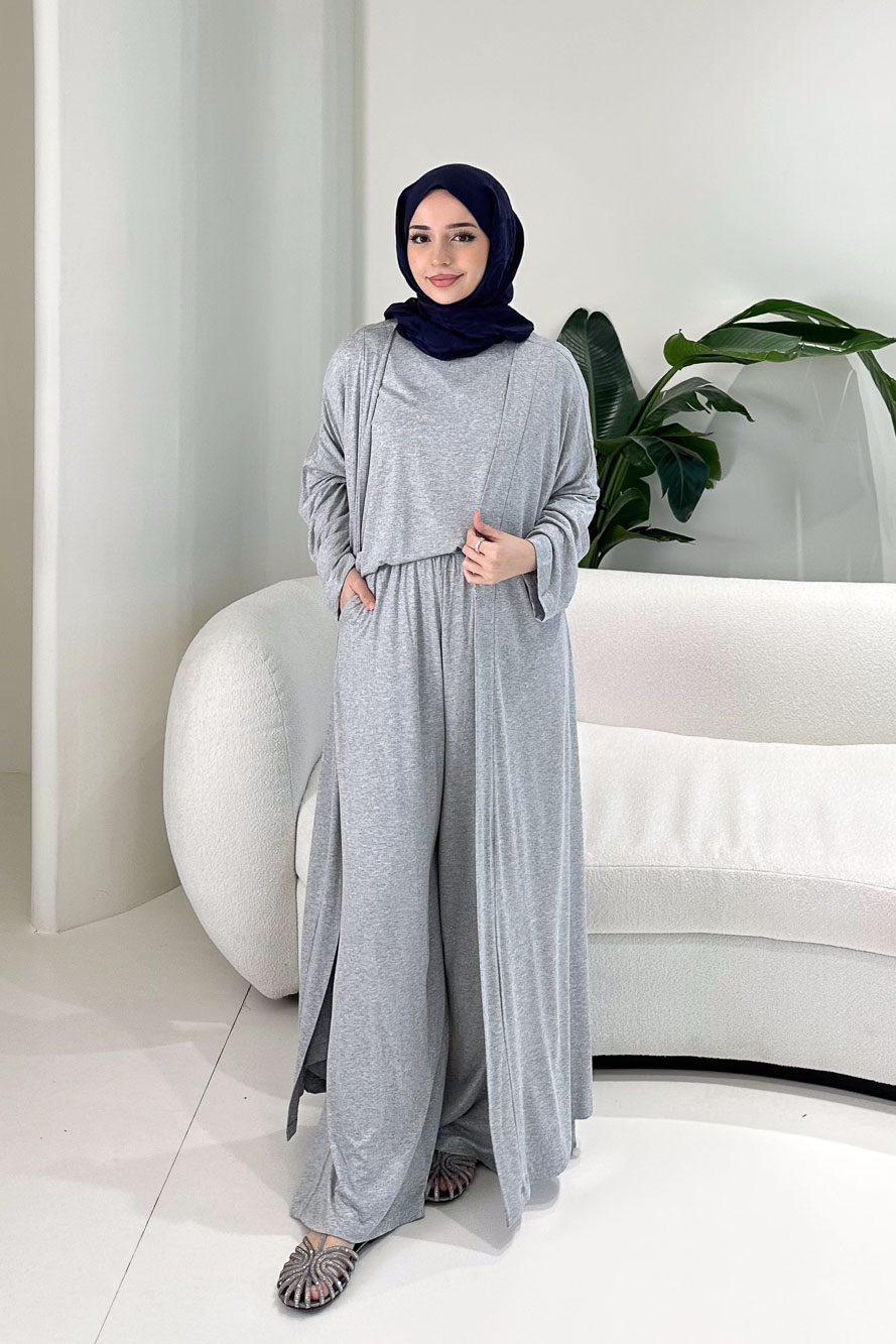 Takım; uzun üst, pantolon ve içlikten oluşur. Üst parça yan yırtmaç detayı ile hareket kazandırırken, içlik ile kombin tamamlanır. Pantolonun beli tam lastiklidir ve rahat bir kullanım sağlar. Cepli yapısı ile fonksiyonellik sunar. Manken üzerinde SM bedendir.